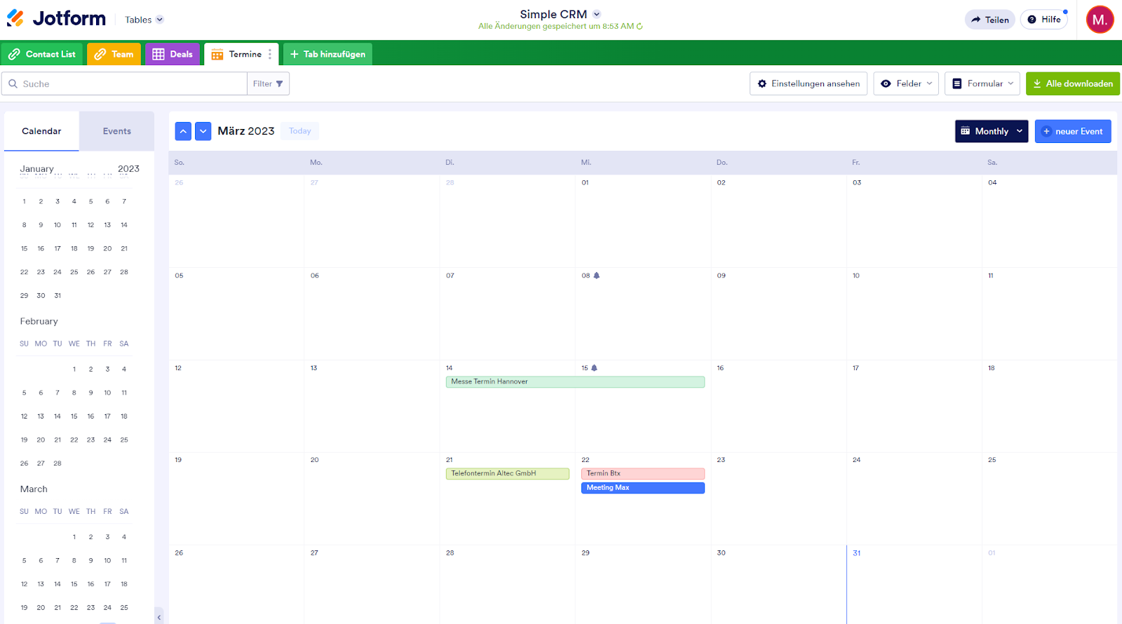 Mit dieser Ansicht können Sie Tabelleneinträge oder Informationen von Personen, die ein Onlineformular ausgefüllt haben, in einer Kalenderansicht anzeigen. Sie können dem Kalender auch manuell neue Einträge hinzufügen und sich einen Überblick über die monatlichen, wöchentlichen oder täglichen Termine verschaffen. Diese Ansicht ist besonders nützlich, wenn Sie Daten aus Reservierungs-, Planungs-, Buchungs- und Terminformularen in einem Kalender sehen möchten.