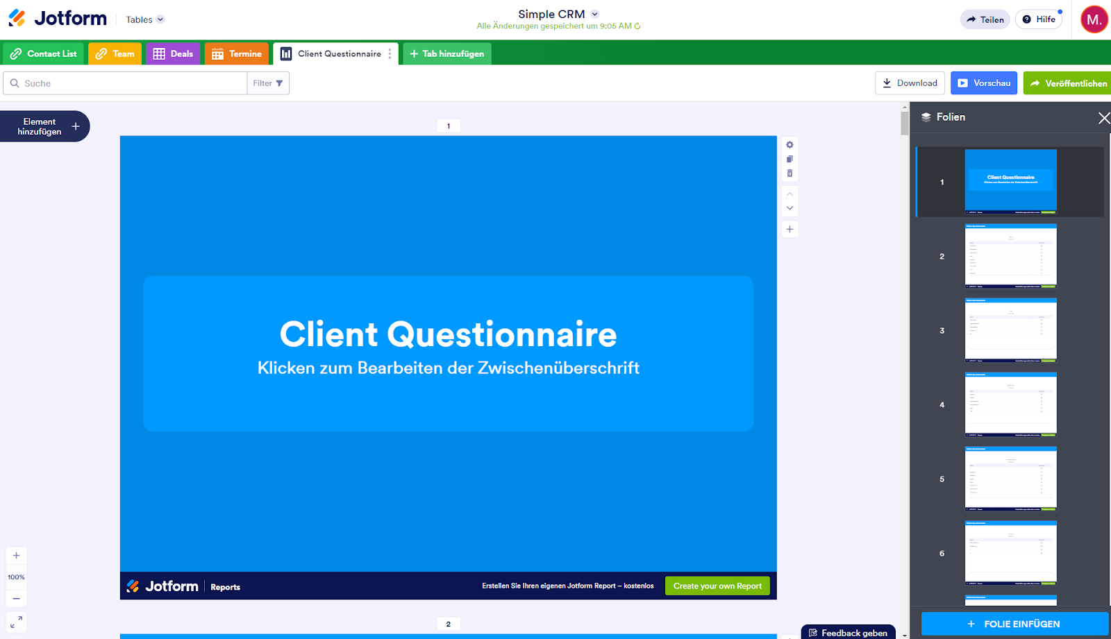 Um einen reibungslosen Workflow zu schaffen, haben wir die Funktionen des Jotform Report Builders zur Berichterstellung in Jotform Tabellen integriert. So können Sie in kürzester Zeit eine individualisierbare Präsentation erstellen, ohne den Workspace Ihres Teams verlassen zu müssen.