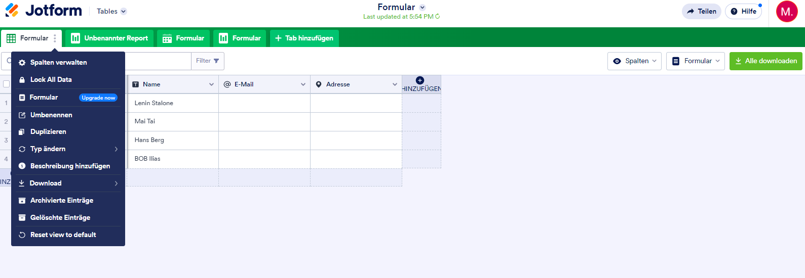 Durch Hinzufügen neuer Reiter können Sie verschiedene Datensätze aus dem bereits mit der Tabelle verknüpften Onlineformular oder einem anderen Jotform Formular analysieren, überwachen und organisieren.