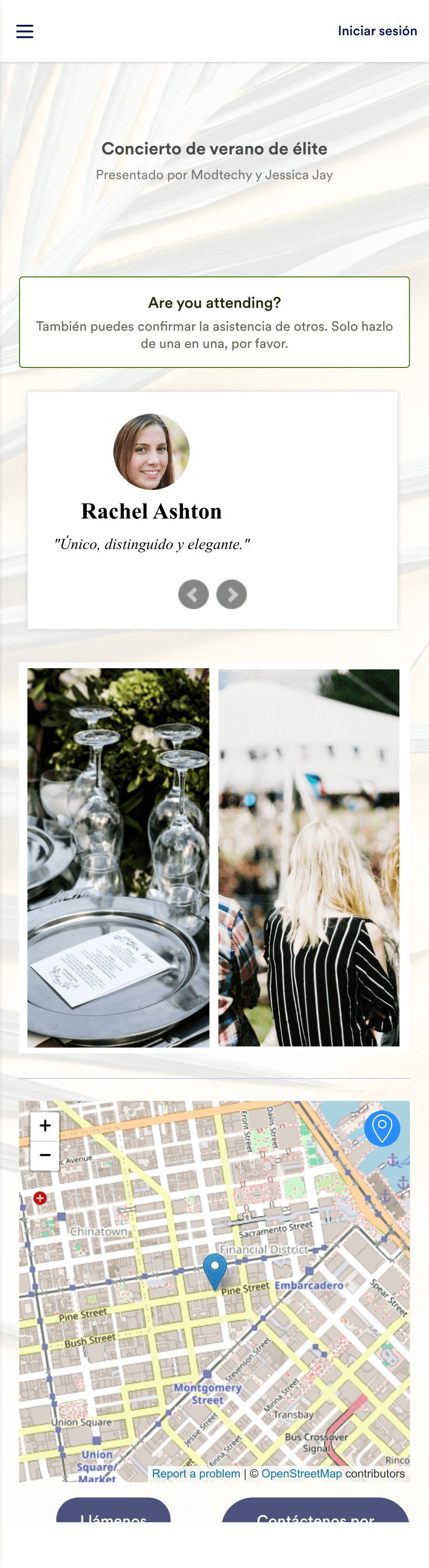 ¿Quiere personalizar su app de confirmación de asistencia? Con nuestro creador de arrastrar y soltar, es fácil añadir formularios, subir imágenes, cambiar fuentes y colores, crear un ícono de app personalizado y mucho más, sin necesidad de programar. Incluso puede agregar texto e imágenes a la pantalla de inicio de su aplicación para personalizarla aún más. Cuando esté lista, solo tiene que compartir un enlace a su aplicación por correo electrónico o redes sociales y ya estará lista para usar. ¡Haga que las confirmaciones de asistencia a su próxima fiesta sean un poco más elegantes con esta App de confirmación de asistencia personalizable!