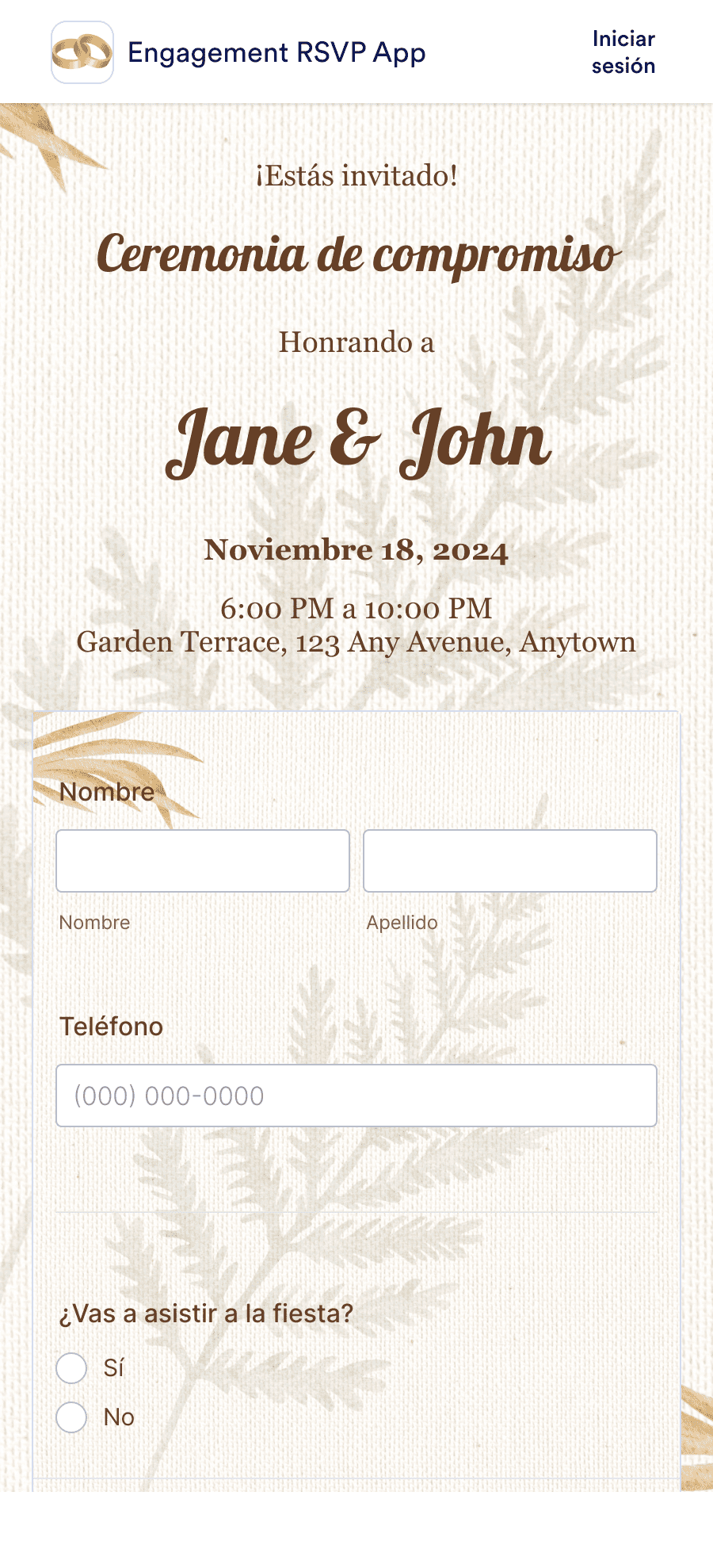 Una app de confirmación de asistencia a un compromiso se utiliza para invitar a los asistentes a una fiesta de compromiso y registrar las confirmaciones de asistencia. Tanto si está celebrando su propio compromiso como si organiza fiestas de compromiso para clientes, esta app de confirmación de asistencia a un compromiso ya preparada le permite recibir rápidamente las confirmaciones de asistencia de los invitados en cualquier dispositivo. Solo tiene que compartir la app por correo electrónico, añadirla a las redes sociales o insertarla en el sitio web del evento para empezar a recopilar rápidamente las confirmaciones de asistencia.