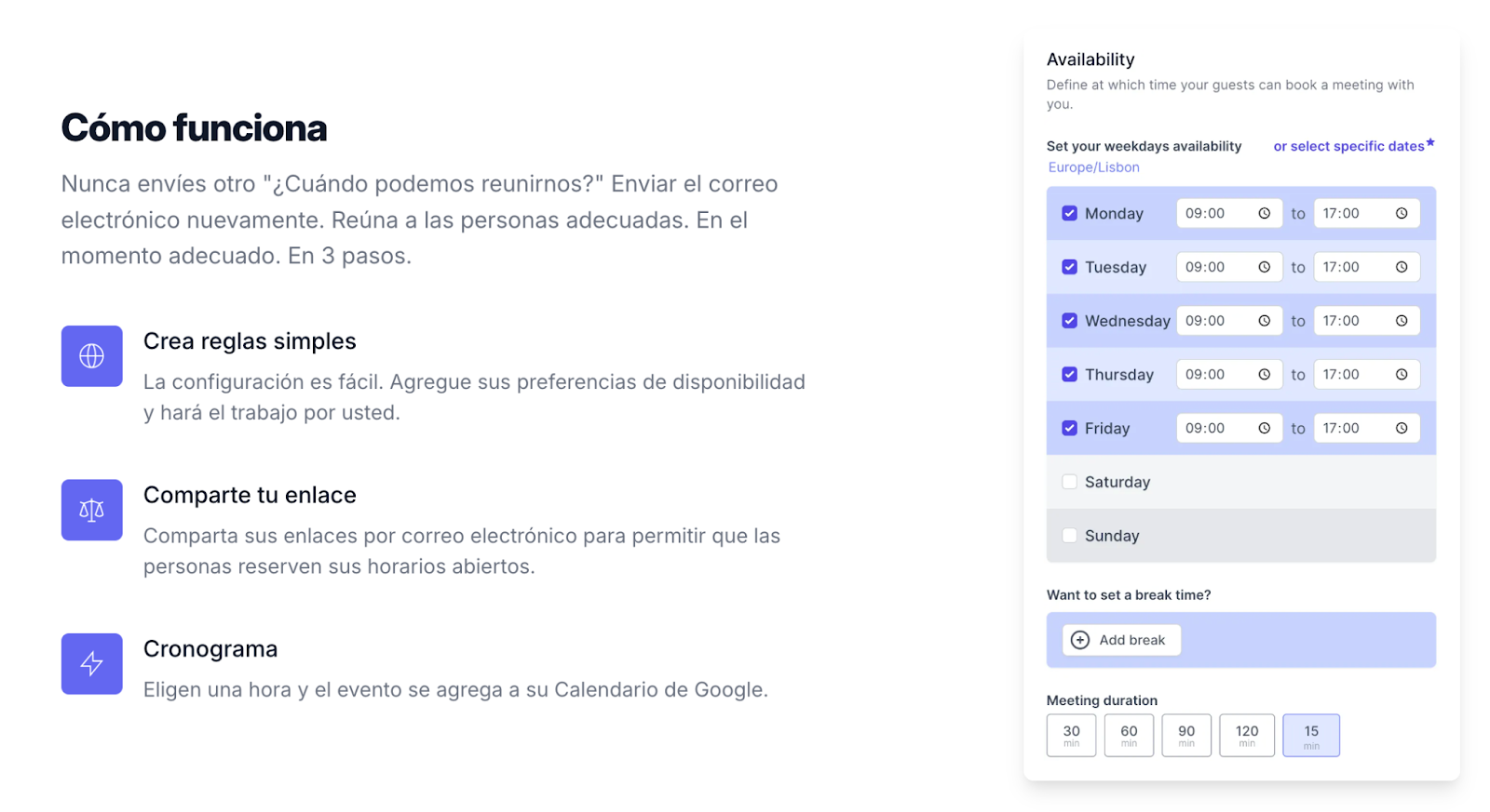 Koalender es una herramienta de programación que se conecta a su calendario y simplifica el proceso de establecer reuniones. Es una plataforma fácil de usar con la que puedes programar reuniones con compañeros de trabajo o dejar que los clientes reserven ellos mismos sus citas.