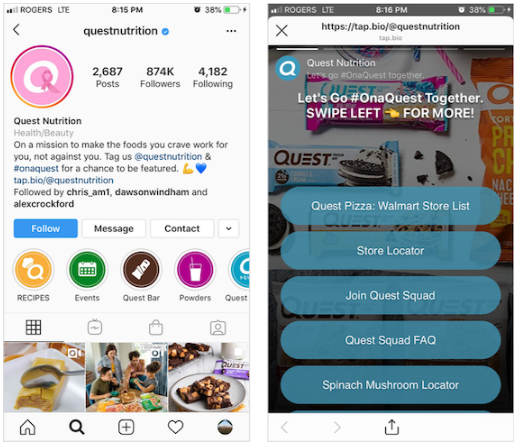 Dado que la interfaz luce familiar a los usuarios de Instagram, será más probable que se queden y vean sus enlaces, en lugar de salir. Algunos usuarios importantes de Tap Bio incluyen a Politico, Quaker, Kayak y OpenTable.