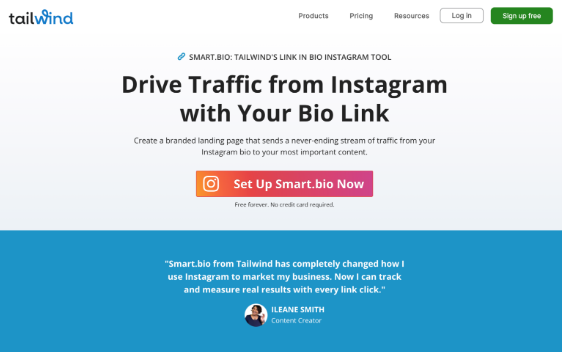 Smart.bio de Tailwind se define como una herramienta de Instagram de enlace en la bio que permite la creación de una página de inicio con su marca, la cual dirige el tráfico desde su bio “a su contenido más importante”. Puede promocionar su contenido, vender sus productos y generar prospectos al añadir enlaces a ofertas, productos y más.