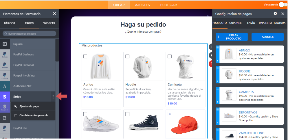 Tras seleccionar la plantilla, añada una integración de pagos como Stripe, PayPal o Venmo. Para ello, vaya al menú Pagos en Elementos de formulario a la izquierda. Esta plantilla está configurada para conectarse con Stripe, pero puede elegir una opción diferente haciendo clic en el elemento de pago de Stripe y seleccionando Cambiar a otra pasarela. Si desea utilizar Stripe, haga clic en Configuración de pagos.