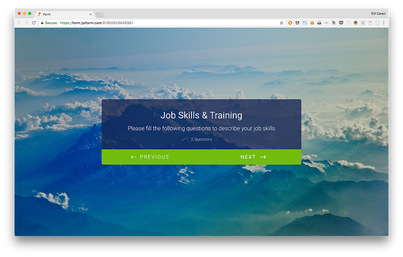 Puede marcar el ‘tema’ para cada grupo (i.e lo que une las preguntas en grupo) con un encabezado corto pero informativo arriba del encabezado de cada sección ( detalles de contactos- detalles personales- experiencia de trabajo). Esto permite al usuario escanear rápidamente el formulario para ver qué tipo de información necesitarán proveer.