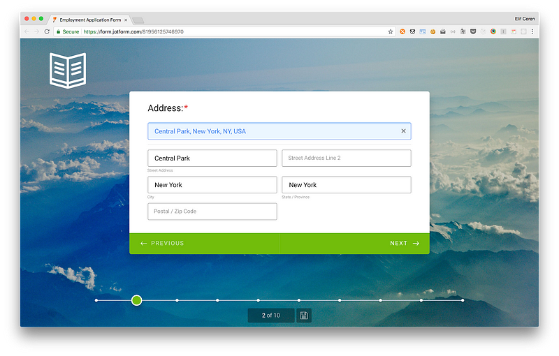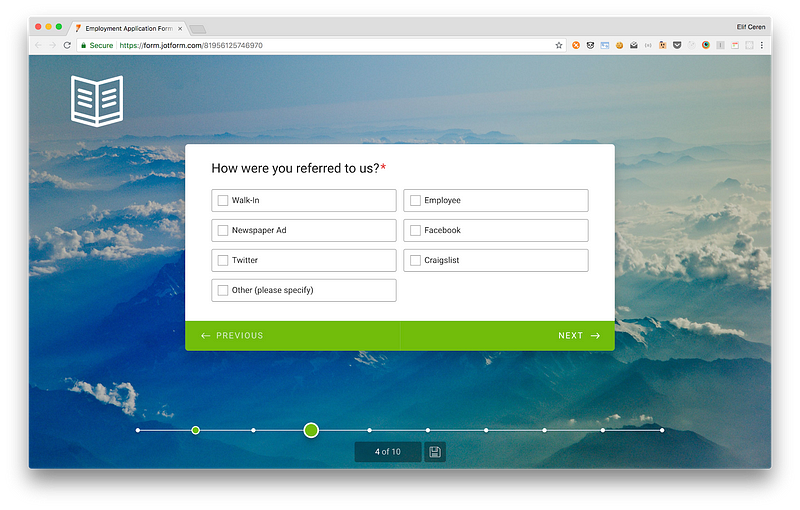 Por este diseño, también agregamos una página resumen y una barra de progreso. Esto despliega cuantas preguntas faltan y cuántas han sido completadas, motivando a los usuarios y animándolos a terminar el formulario dotado de efectos de progreso.