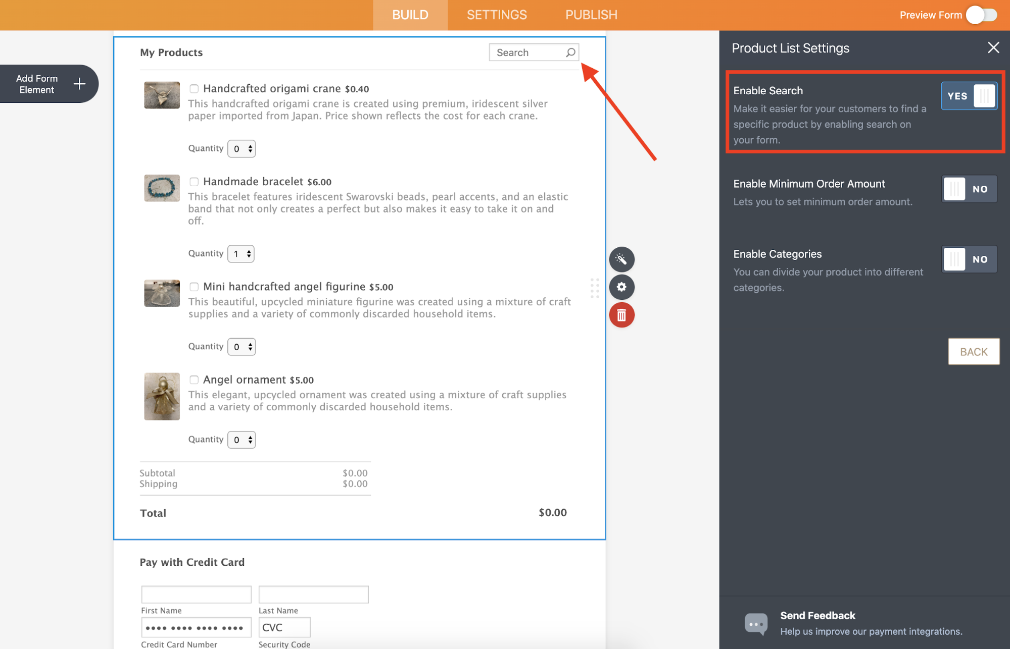 - Pulse el interruptor de SÍ -NO a “SÍ” para la opción de Habilitar Búsqueda bajo el menú de Ajustes de la Lista de Productos. Esto va a desplegar la herramienta de búsqueda de su integración de pago en su formulario de orden en línea.