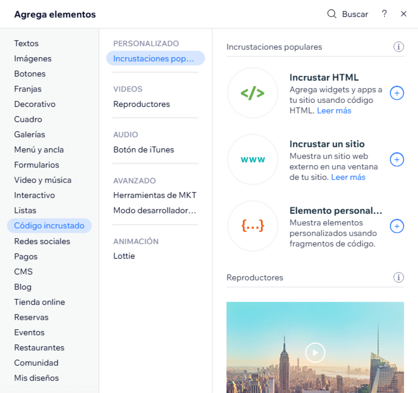 - Abre el menú de Agregar Elementos en el lado izquierdo y selecciona Código Incrustado de las opciones a la izquierda.