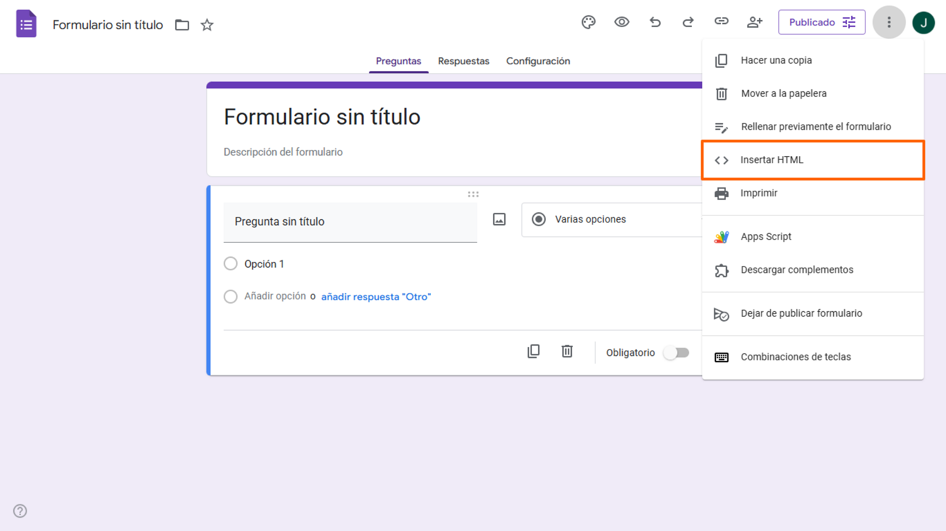- Abre el formulario que deseas insertar en el Creador de Formularios y haz clic en el botón Publicar en la parte superior de la página.