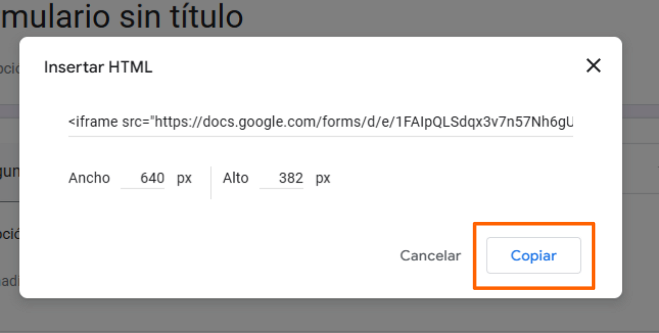 - Ajusta la altura y el ancho de tu formulario insertado si es necesario, y haz clic en el botón Copiar en la esquina inferior derecha para copiar tu código de inserción.