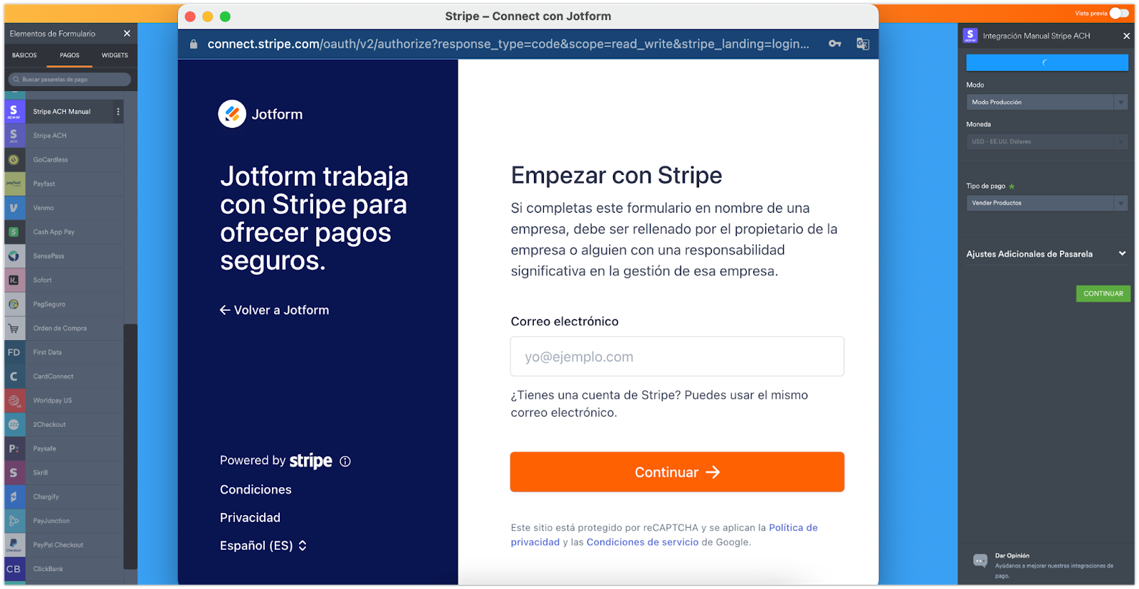 En esta versión de la integración, puede conectarse a su cuenta de Stripe solamente con pulsar e ingresar a ella por medio del Creador de Formularios de Jotform.
