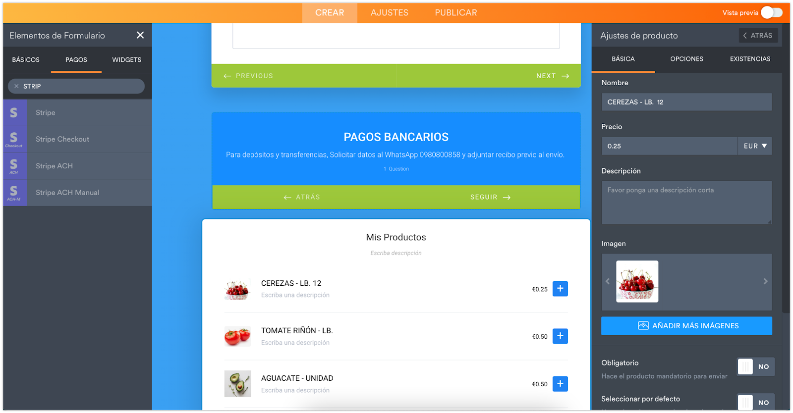 - Desde el Creador de Formularios, encuentre Stripe ACH bajo la pestaña de Pagos en los Elementos del Formulario. Solamente pulse el ícono para agregarlo a su formulario.