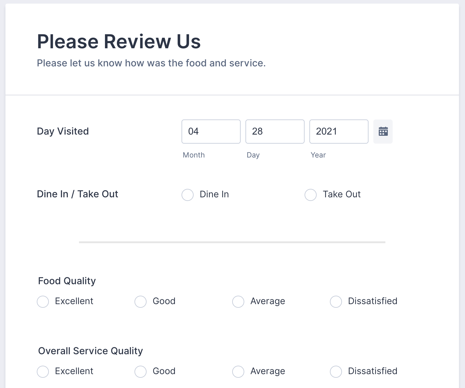 Como se esperaba de una encuesta de restaurante, las preguntas se refieren a la precisión del pedido, la limpieza, la velocidad del servicio y la experiencia general. También hay una pregunta abierta para comentarios y sugerencias generales.