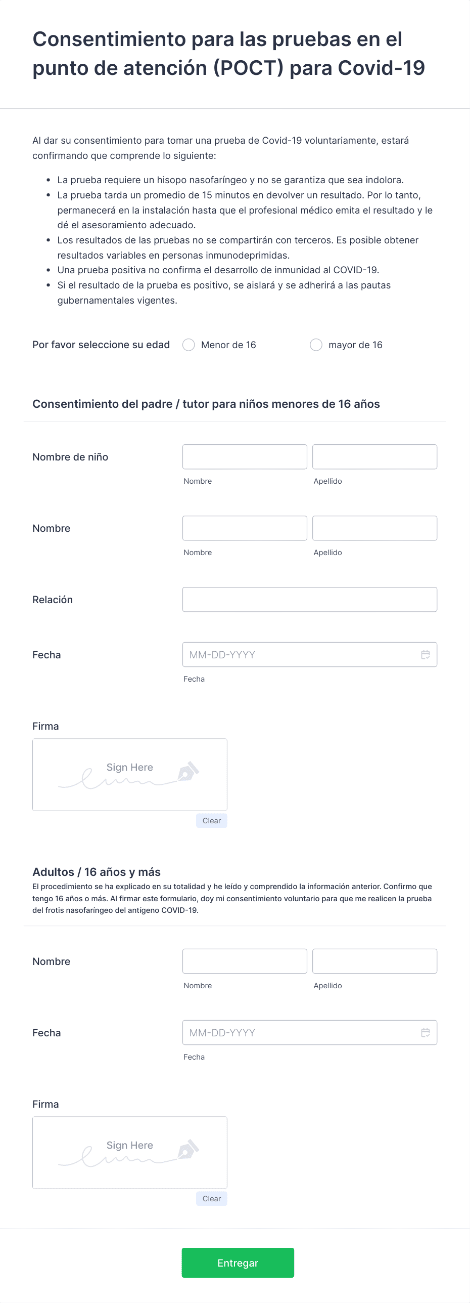 "Una prueba de RT-PCR de COVID-19 es una prueba de reacción en cadena de la polimerasa con transcripción inversa en tiempo real que detecta el coronavirus en los sistemas respiratorios a través de un hisopo nasal. Si su centro de atención médica actualmente realiza pruebas con hisopos nasales para detectar y prevenir el coronavirus en pacientes, manténgase organizado con nuestro formulario de solicitud de RT-PCR de COVID-19 gratuito. Los pacientes pueden usar cualquier dispositivo para ingresar su información personal, describir el motivo para programar la prueba y dar su consentimiento a sus pautas con una firma electrónica legalmente vinculante. Los envíos se reciben de inmediato y se almacenan en su cuenta segura de Jotform, protegida por el cumplimiento de HIPAA con un plan actualizado. ¿Necesita más de nuestro formulario de solicitud de RT-PCR COVID-19? No hay problema, solo use nuestro Creador de formularios de arrastrar y soltar para realizar los cambios necesarios. Personalice el formulario de solicitud agregando más campos de formulario o un calendario de citas, cambiando el diseño, editando los términos y condiciones e incluso incluyendo su logotipo. También puede integrarlo con más de 100 aplicaciones para sincronizar instantáneamente los envíos a cuentas como Google Drive, Dropbox, Box o Airtable. Administre las solicitudes de pruebas de coronavirus de manera fácil y sin contacto con un formulario de solicitud de RT-PCR COVID-19 en línea eficiente."