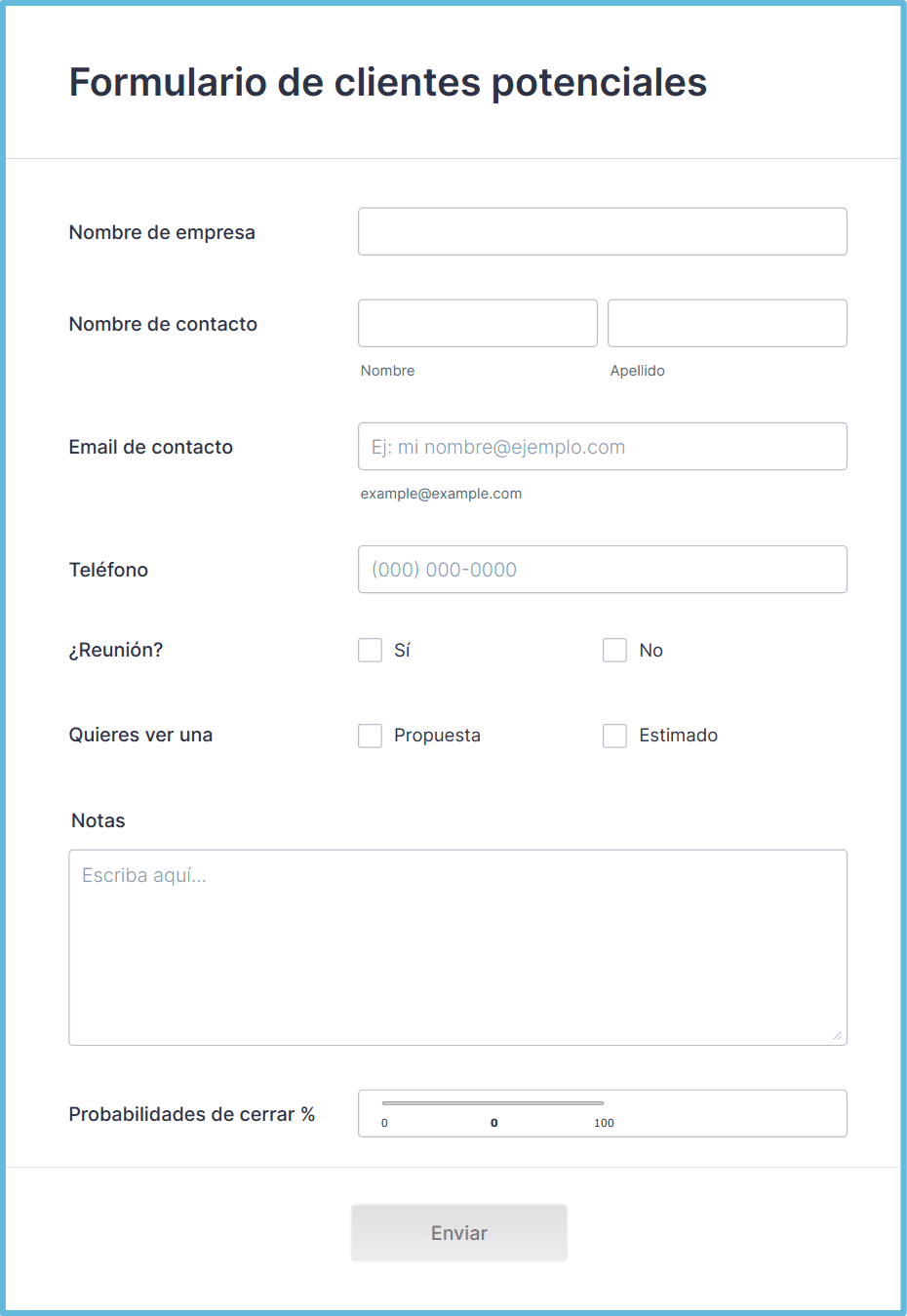 - Ayuda a calificar clientes potenciales registrando información específica (por ejemplo, presupuesto, tamaño de la empresa).