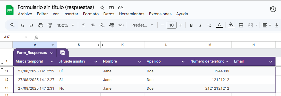 - Google Forms envía los datos del formulario a Hojas de cálculo de Google.