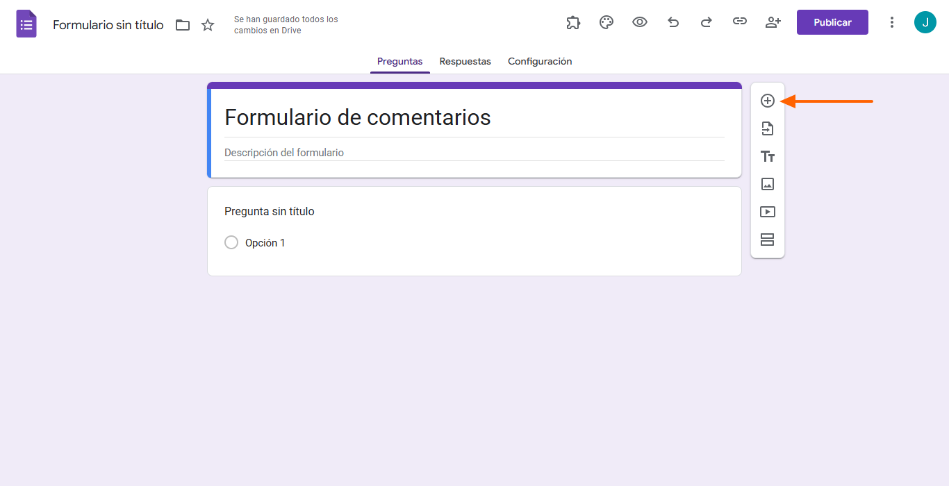 - En el creador de formularios, selecciona el icono de más en la barra de herramientas a la derecha para añadir preguntas a tu formulario. Aunque no hay límite en el número de preguntas que puedes incluir, ten en cuenta que es probable que recibas más respuestas a una encuesta corta o de longitud media.