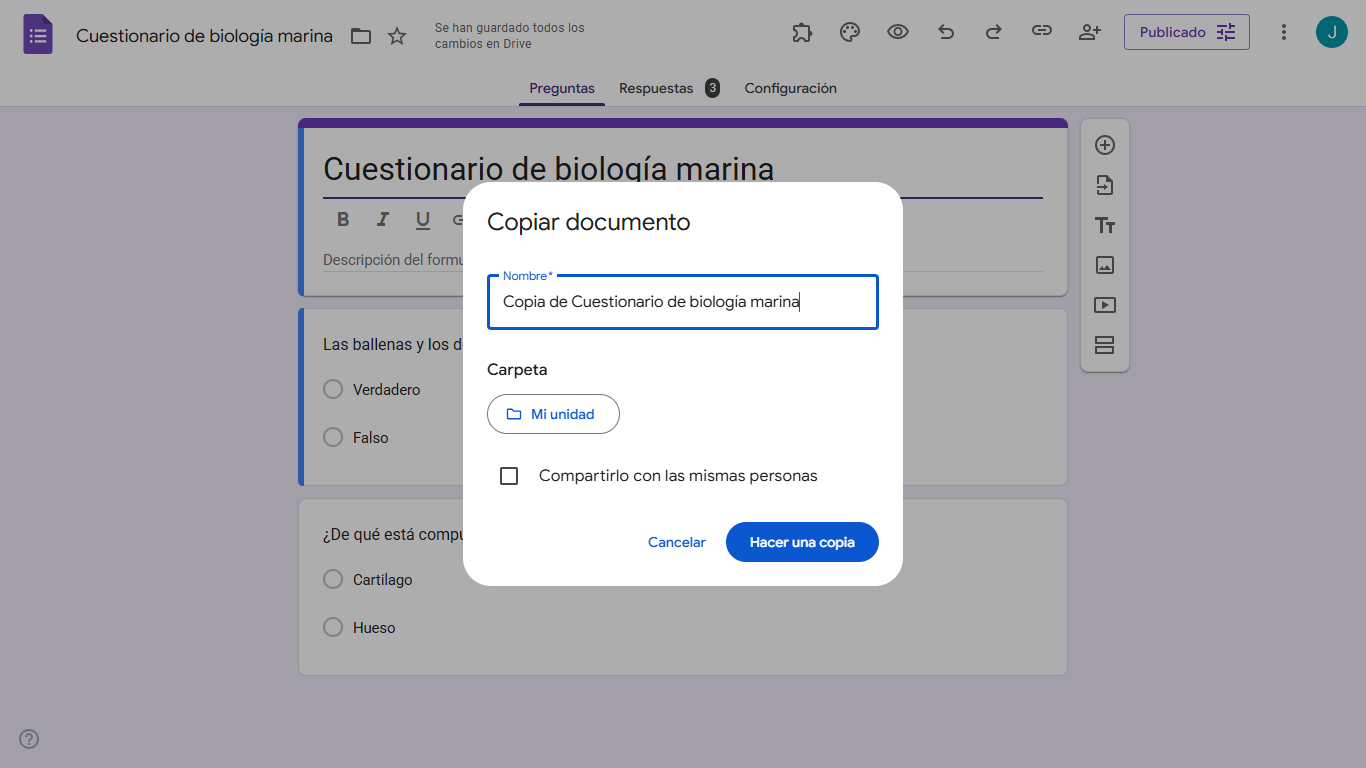 - En la ventana que aparece, escribe un nombre para el nuevo formulario y selecciona la carpeta donde deseas guardarlo. También tienes la opción de compartir el formulario con las mismas personas que antes. Después de completar estos pasos, haz clic en Hacer una copia.