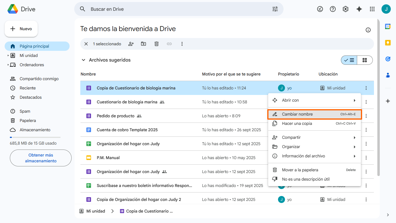Para mantener las cosas claras, renombra la copia. Haz clic derecho en el archivo copiado y selecciona Cambiar nombre del menú. Escribe un nuevo nombre para el archivo y presiona Enter.