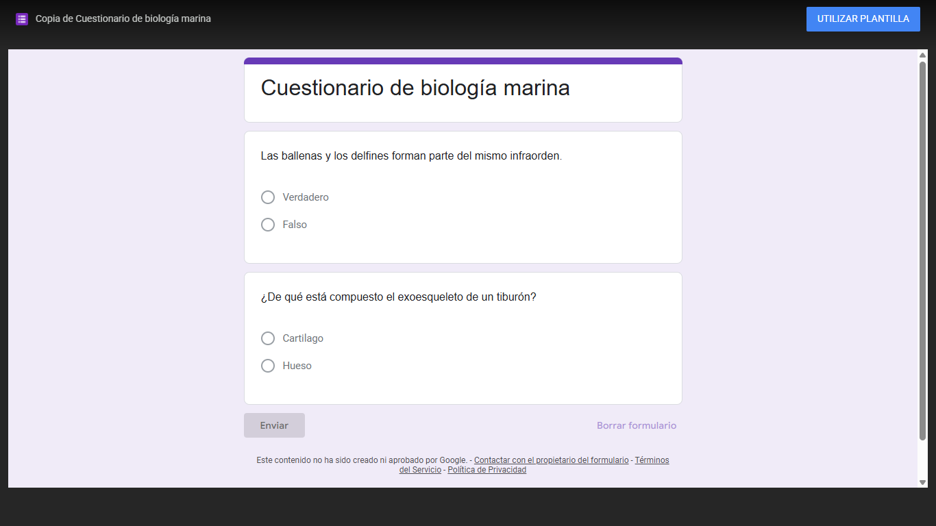 Ahora que entiendes cómo hacer una copia de un formulario de Google, vamos a cubrir cómo puedes hacer una copia de una plantilla de formulario de Google. Simplemente elige una plantilla de la galería de plantillas y haz clic en el botón azul Usar plantilla, que abrirá una versión editable del formulario. El nuevo formulario se añadirá automáticamente a tu Drive, donde podrás renombrarlo usando los pasos mencionados anteriormente.