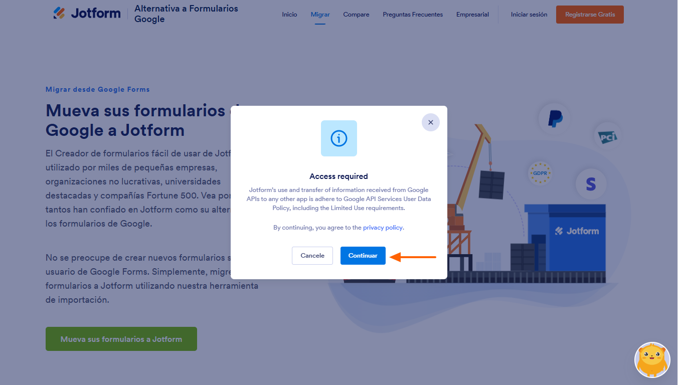 - Acepte la política de privacidad de Jotform haciendo clic en Continuar.