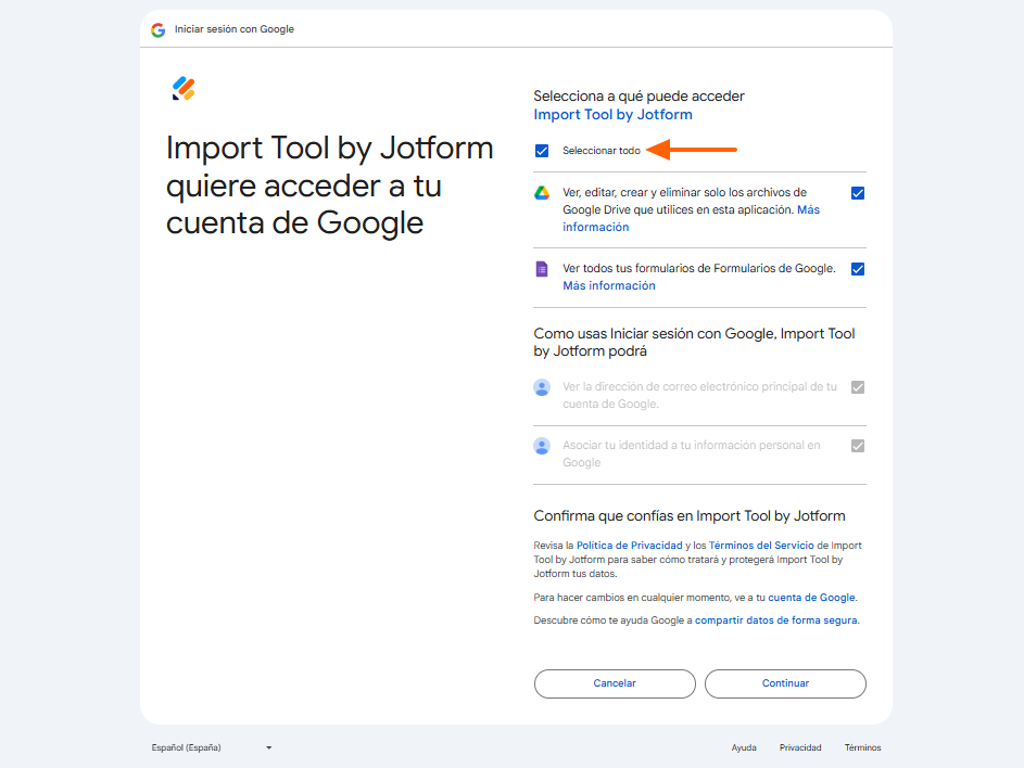 - Inicie sesión en la cuenta de Google desde la que desea transferir formularios y marque la casilla Seleccionar todo para otorgar permisos a Jotform para transferir sus archivos. Luego haga clic en Continuar.