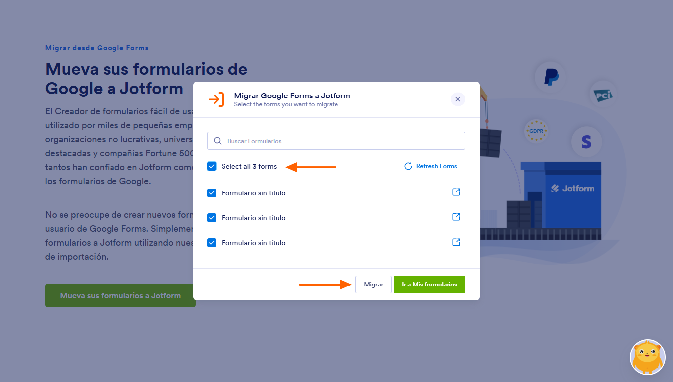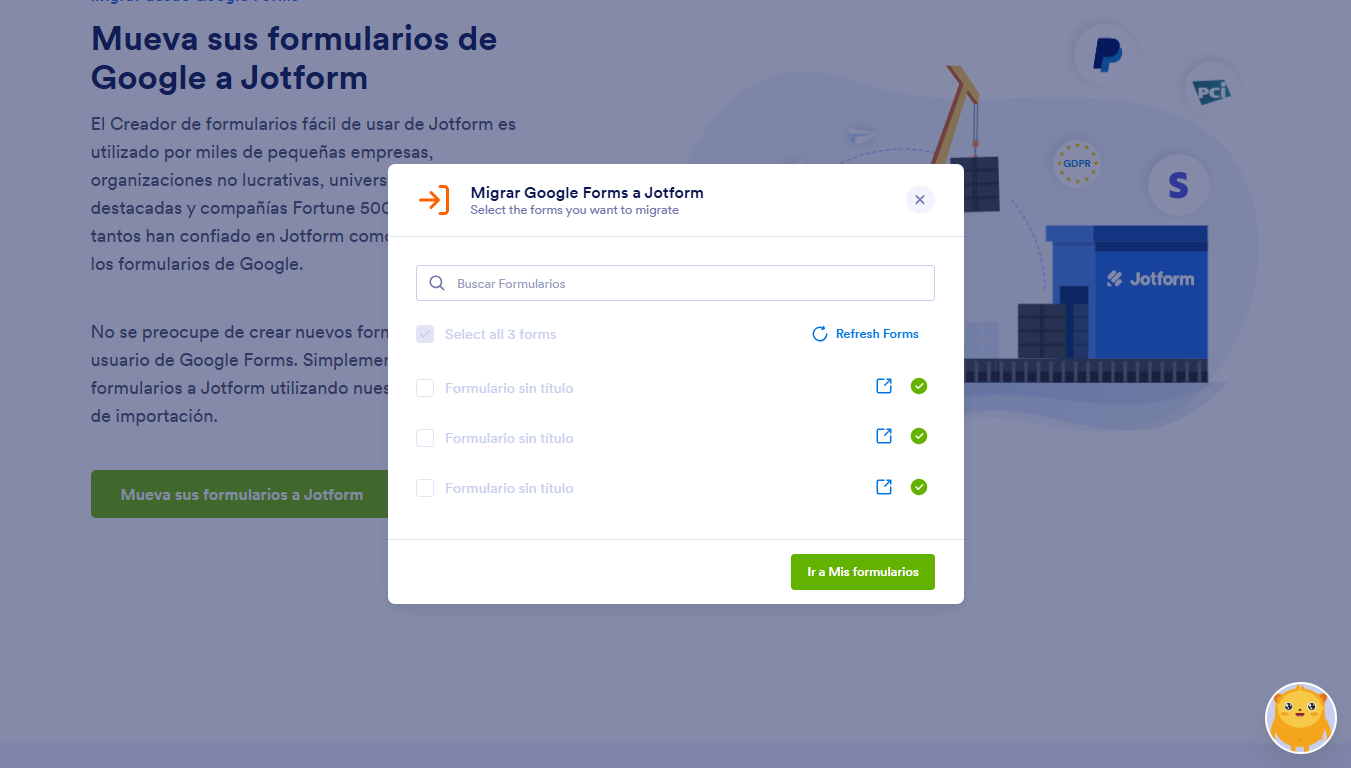Cuando necesite migrar sus Google Forms a un potente creador de formularios en línea interconectado, Jotform está ahí para ayudarle. Migrar Google Forms a Jotform solo lleva unos minutos y puede transferir múltiples formularios simultáneamente: