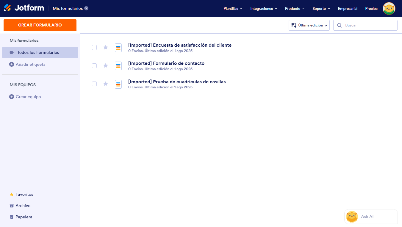- Los formularios migrados se almacenarán en su carpeta Todos los Formularios. Sus formularios importados estarán marcados como “[Importado]”. Siempre puede renombrarlos para eliminar la etiqueta de Importado.