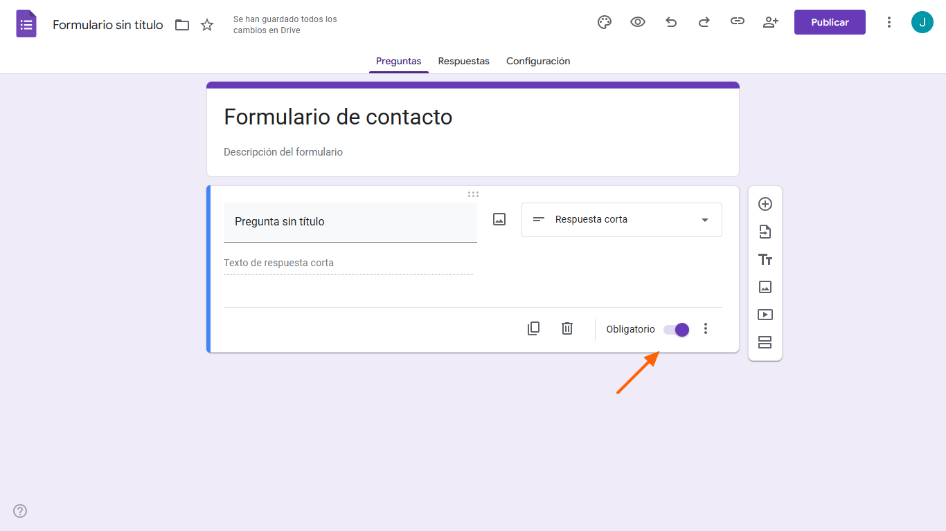 - Para añadir tu siguiente pregunta, haz clic en el símbolo Agregar pregunta + en la barra vertical a la derecha de tu pregunta actual.