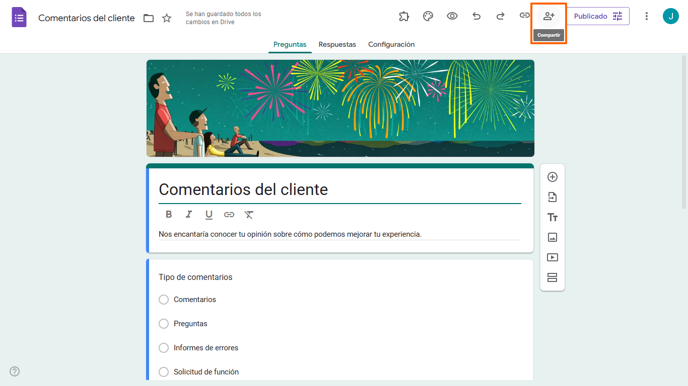 - Una vez que hayas personalizado el formulario, haz clic en Publicar en la esquina superior derecha para que los respondientes puedan acceder al formulario.