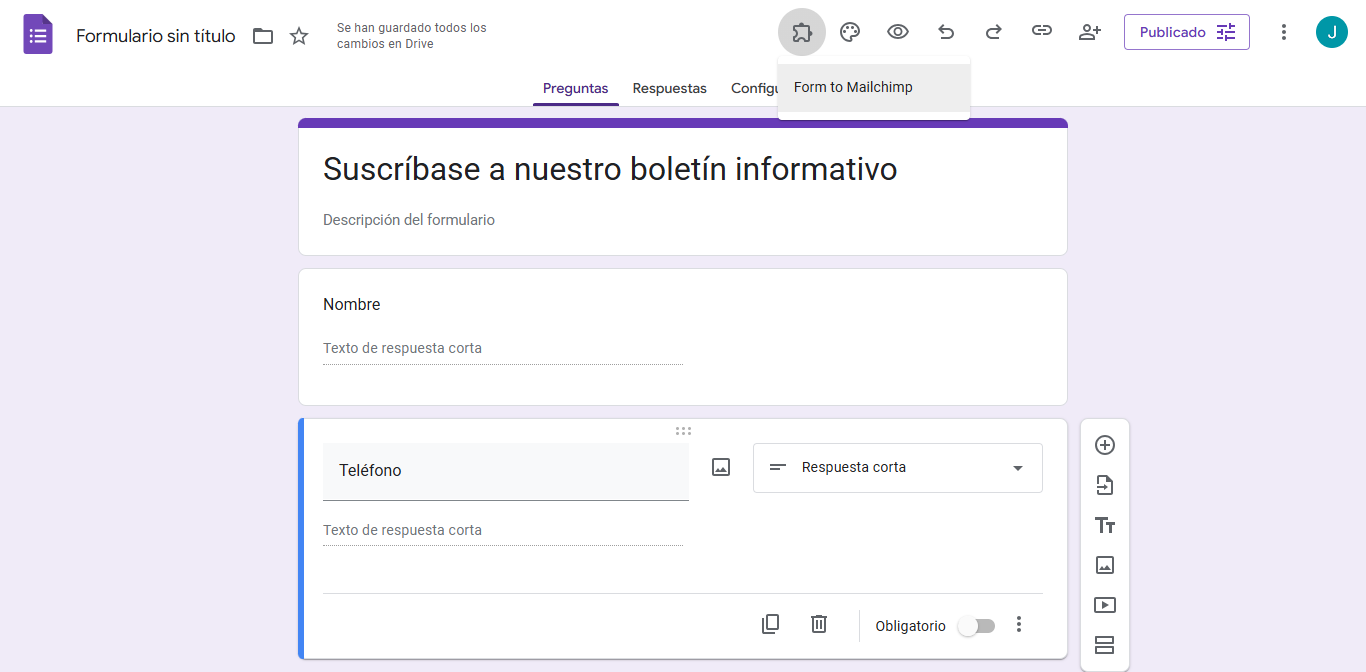 - Crea un Google Form. Verás la opción de complemento en la esquina superior derecha de tu Google Form llamada Form to Mailchimp.