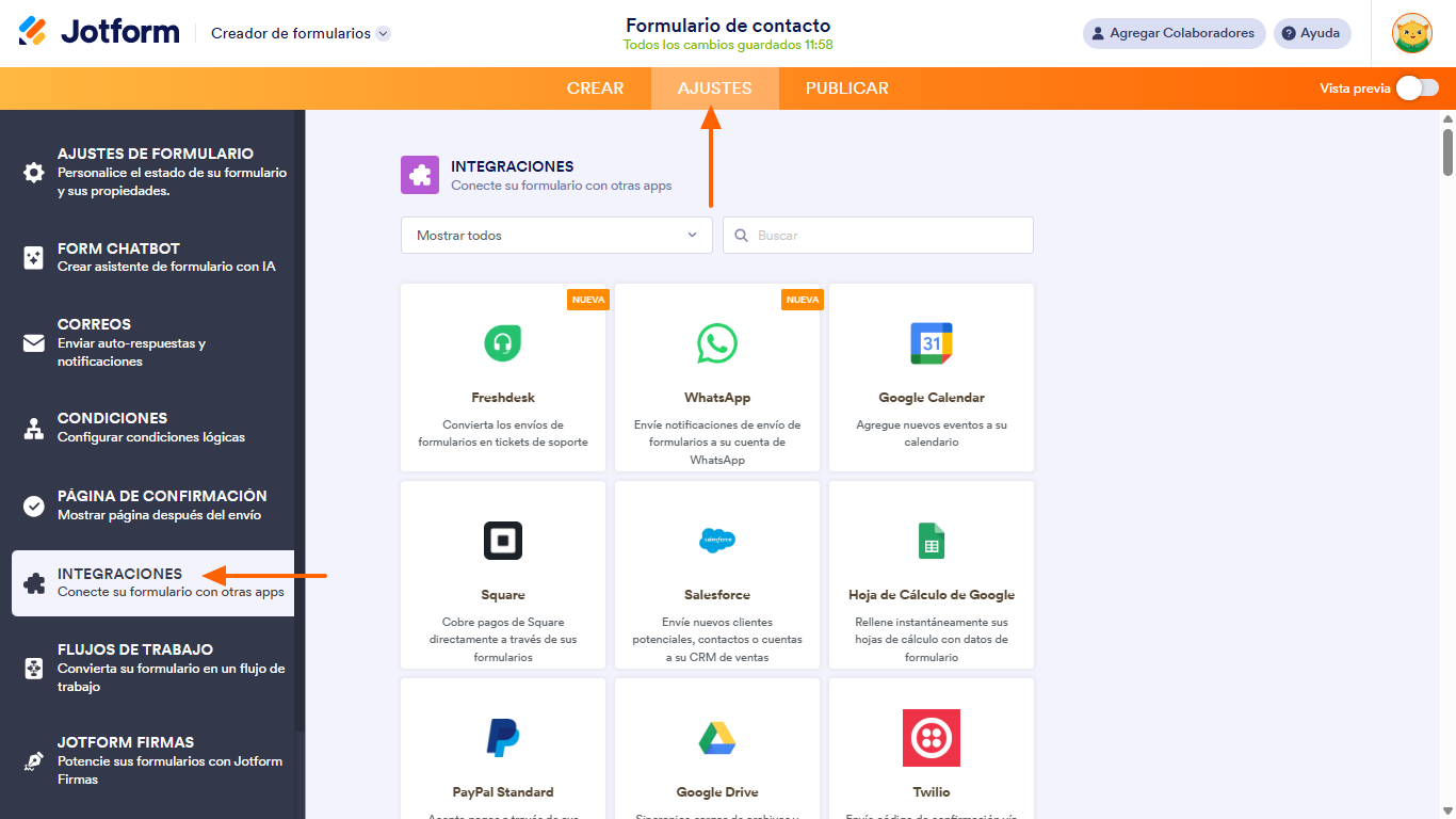 - En el Creador de formularios de Jotform, haz clic en Ajustes.