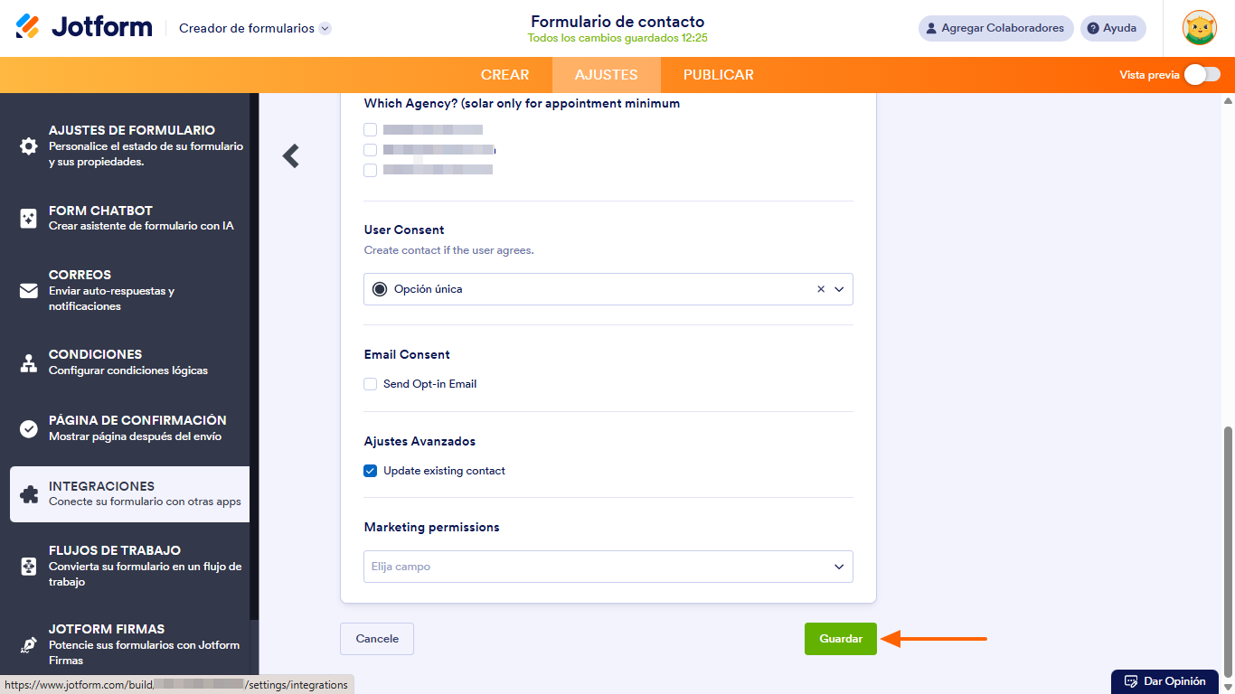 - Enviar Contactos a Mailchimp: Selecciona entre Siempre (sin condiciones) o Solo si el usuario está de acuerdo.