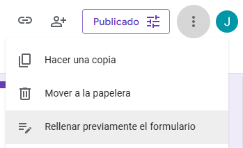 Si ya estás familiarizado con Google Forms, rellenar uno previamente es fácil. Selecciona Rellenar previamente el formulario desde el menú de tres puntos en la esquina superior derecha.