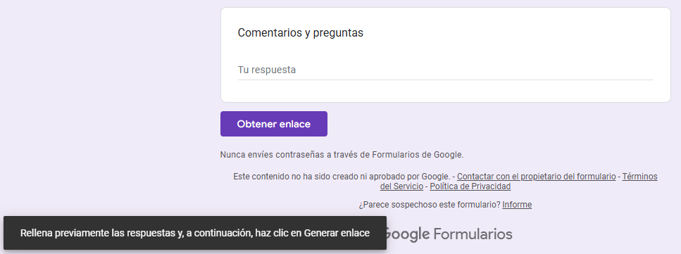 Una vez que hayas terminado, haz clic en el botón Obtener enlace en la parte inferior del formulario. Luego haz clic en Copiar enlace en la parte inferior de la página. Ahora puedes pegar ese enlace en una nueva pestaña para previsualizarlo. O puedes pegarlo en un correo electrónico, una página web o un chat de Slack — donde te resulte más conveniente.