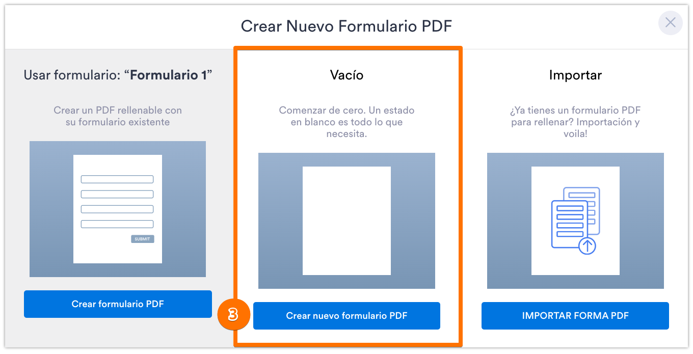 3. En la sección VACÍO de la ventana emergente modal, haga clic en el botón CREAR NUEVO FORMULARIO PDF.