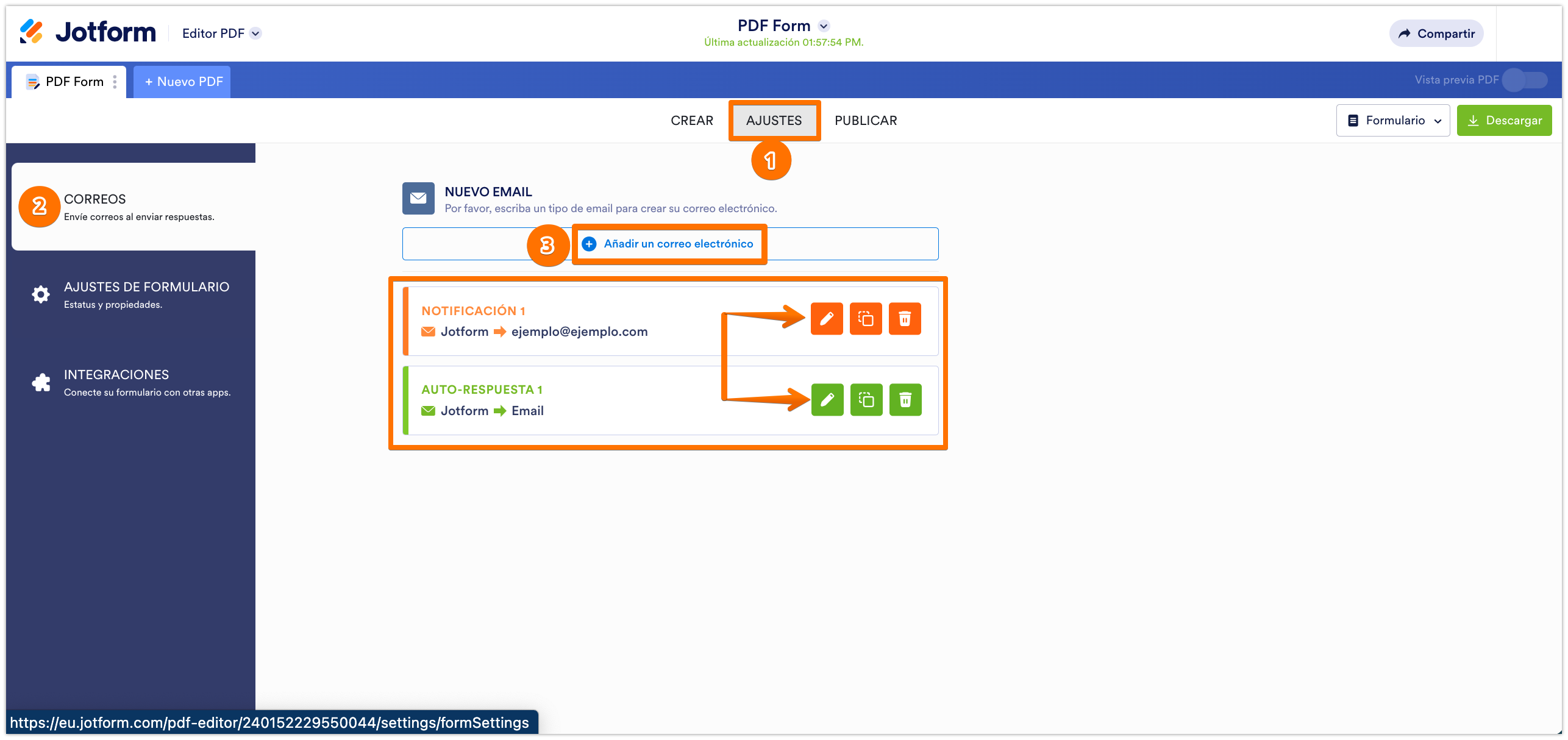Una vez que haya terminado de crear y diseñar su formulario PDF, es hora de configurar las alertas por correo electrónico. Al igual que un formulario web, un formulario PDF puede activar NOTIFICACIONES que se le enviarán a usted y AUTORESPUESTASque se enviarán a sus encuestados.