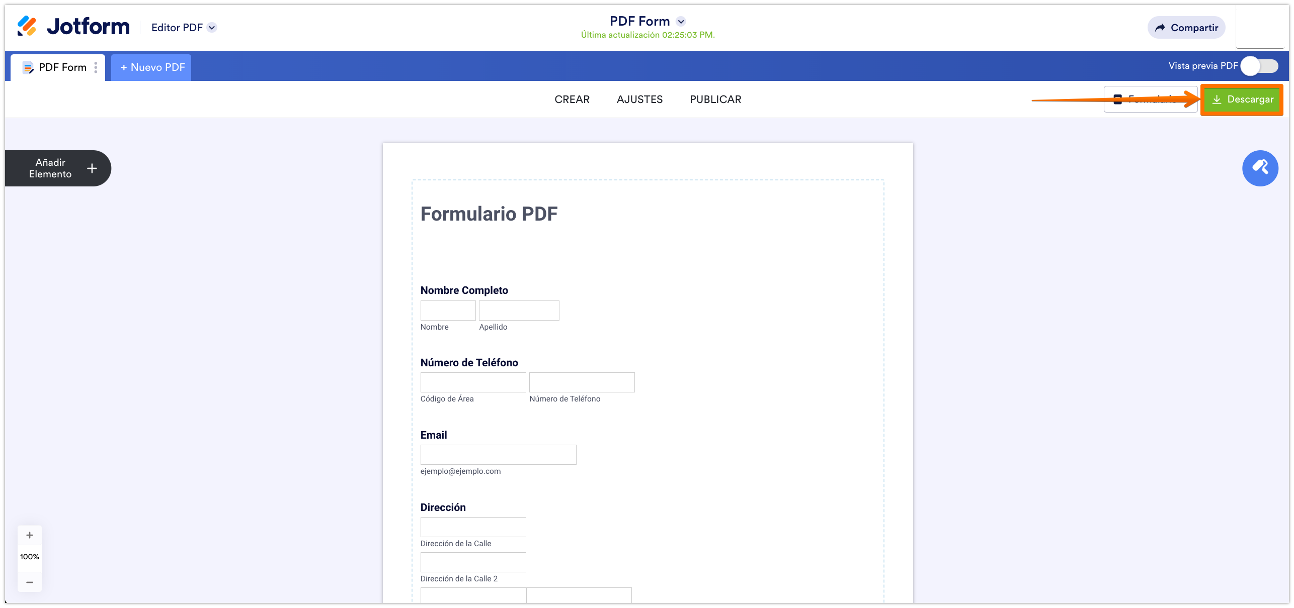 Si ha estado utilizando Jotform y ya ha creado formularios web, puede crear versiones PDF rellenables de estos formularios web. Siguiendo el mismo proceso explicado anteriormente, en lugar de crear un formulario PDF en blanco o importar uno, puede usar el formulario actual cargado en su EDITOR PDF y convertirlo en un formulario PDF rellenable. Simplemente, haga clic en el botón CREAR FORMULARIO PDF.
