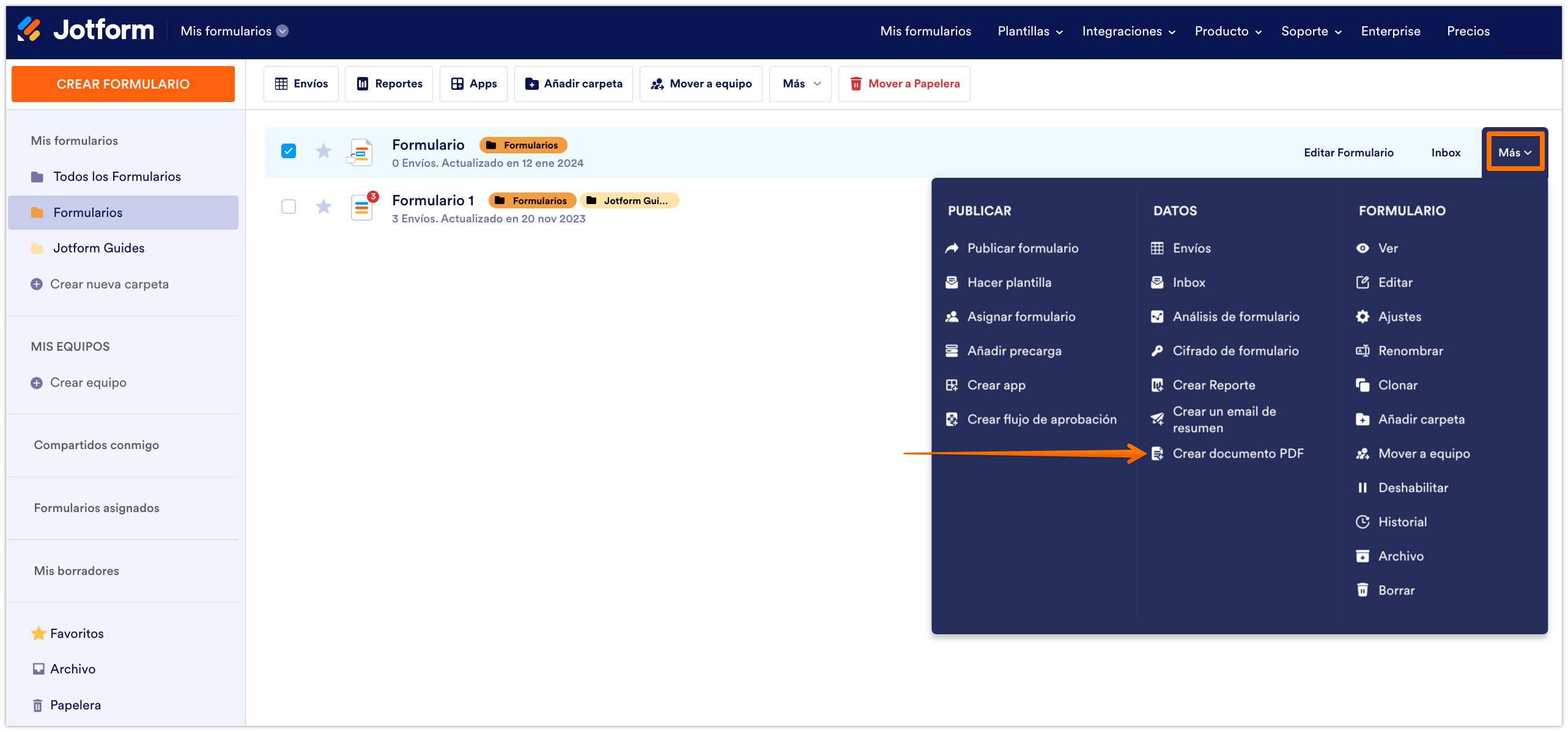 O vaya a https://www.jotform.com/es/pdf-editor/ y elija el formulario del menú desplegable: