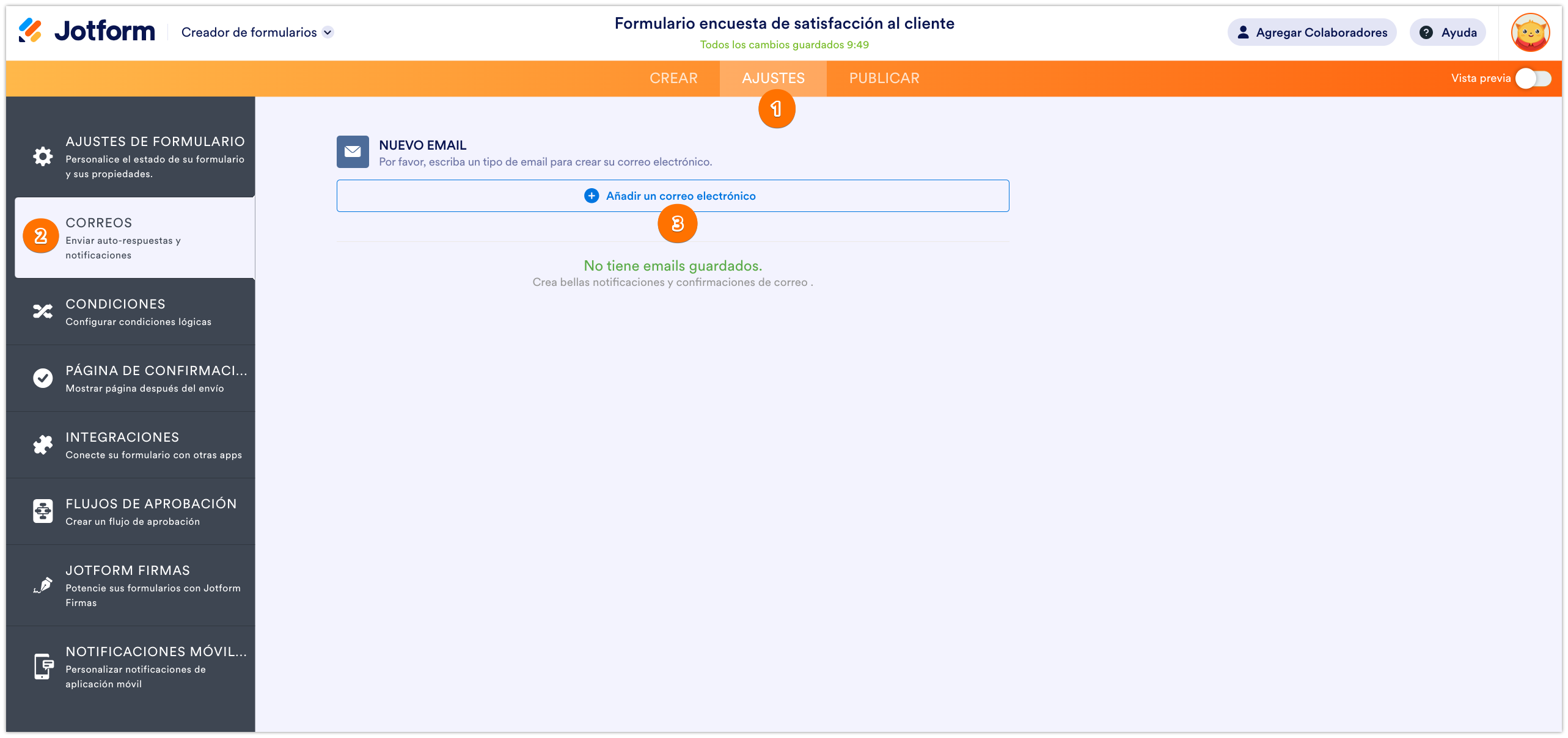 - Haga clic en Ajustes en la parte superior del Constructor de Formularios.