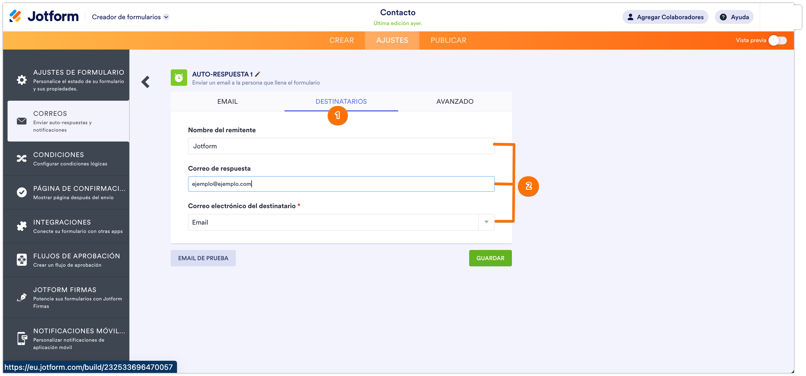 - Configure el Correo Electrónico del Remitente. Tenga en cuenta que se recomienda encarecidamente mantener noreply@jotform.com como Correo Electrónico del Remitente porque esto ayuda a garantizar que el proveedor de correo electrónico del destinatario no identifique la Auto-respuesta como spam.