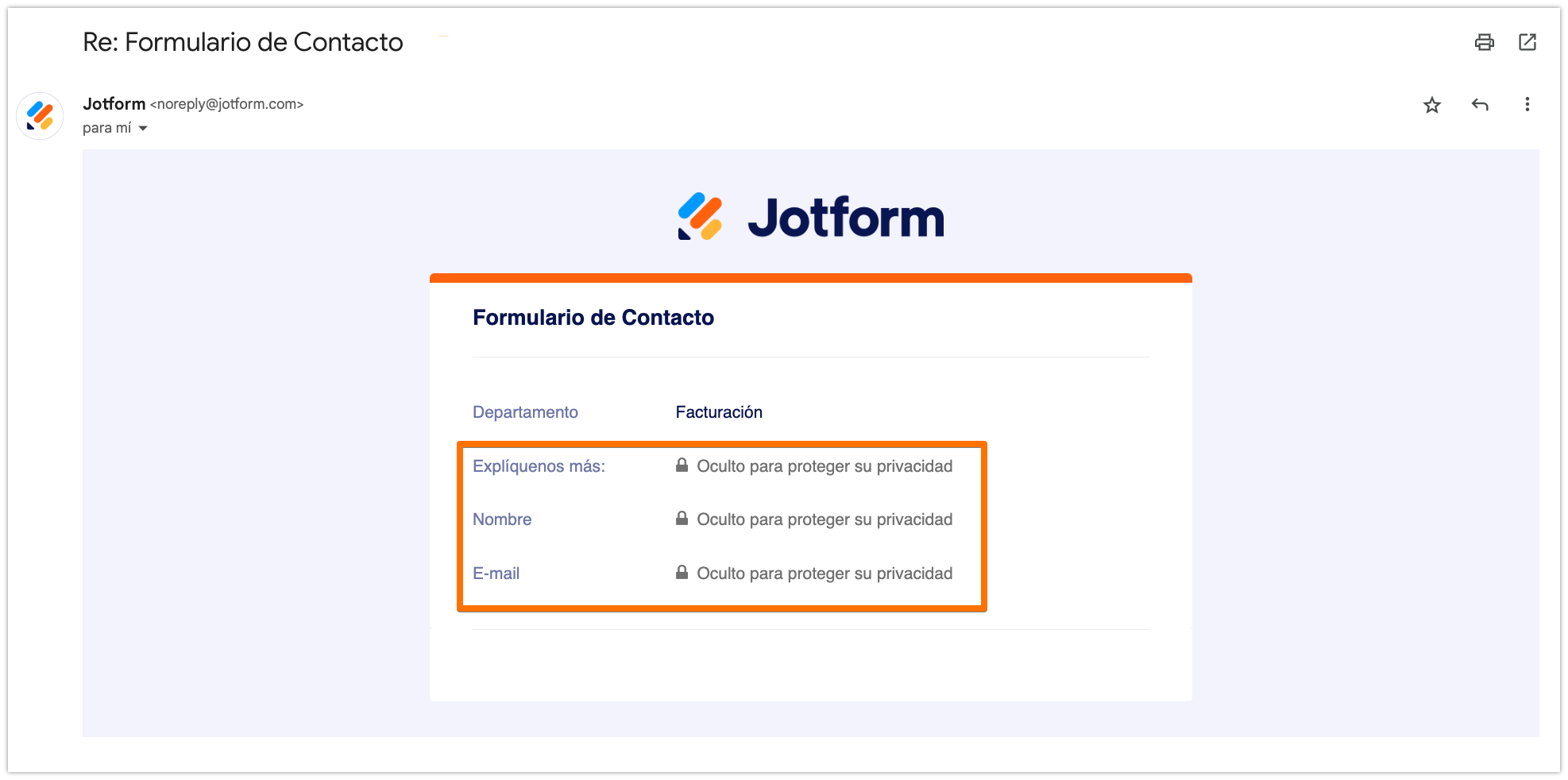 En las cuentas que cumplen con Jotform HIPAA, aún puede usar notificación por correo y respuesta automática. Lo único a lo que debe prestar atención es a no incluir datos sanitarios confidenciales en ellos. Es por eso que debe marcar los campos de su formulario como “Protegido” como se describe en Cómo configurar campos de PHI en sus formularios. Cuando reciba un nuevo envío y si ese envío debe enviarse con el canal de correo, los campos “Protegido” se eliminarán del correo y el correo solo tendrá campos “No protegido“.