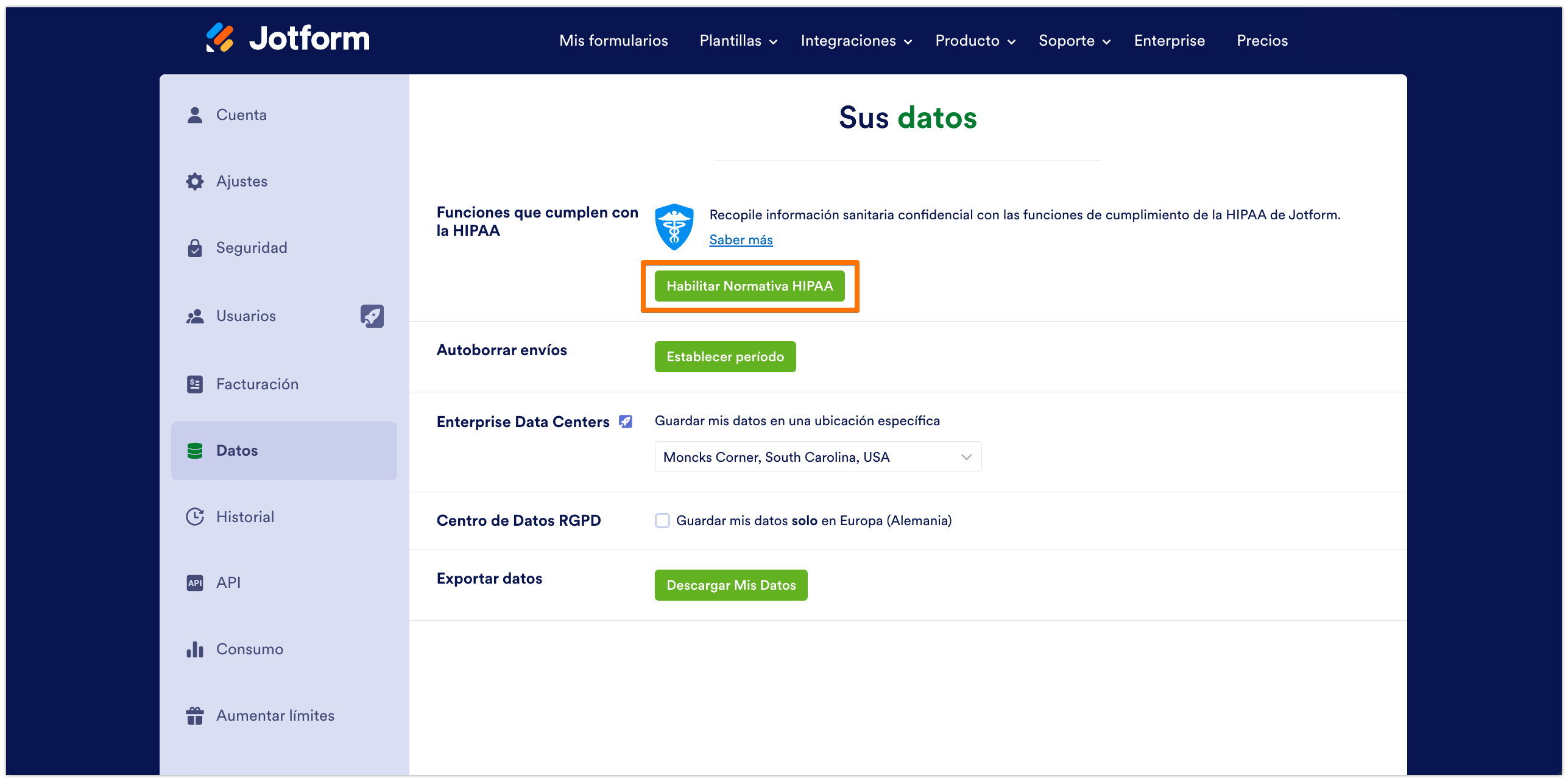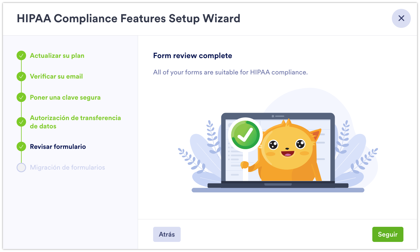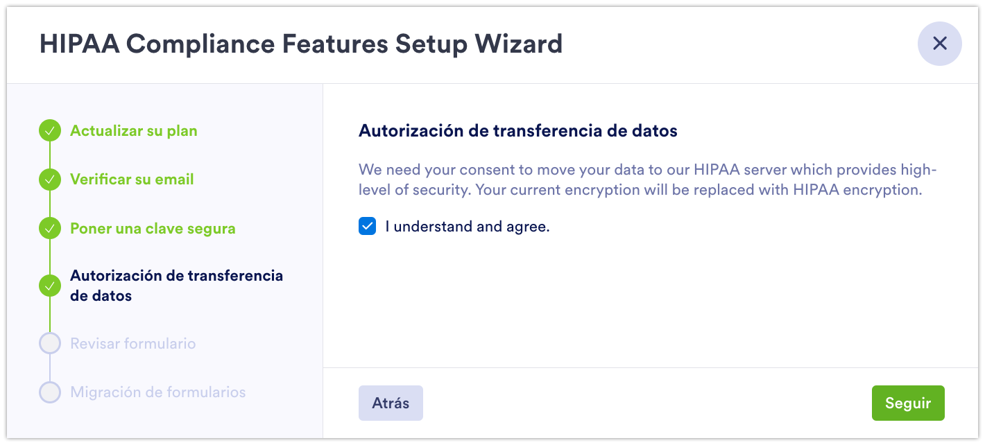 - ¡Felicidades! Su cuenta, formularios y datos ahora cumplen con HIPAA. La insignia de Cumplimiento de HIPAA se agrega automáticamente a su cuenta y formularios.