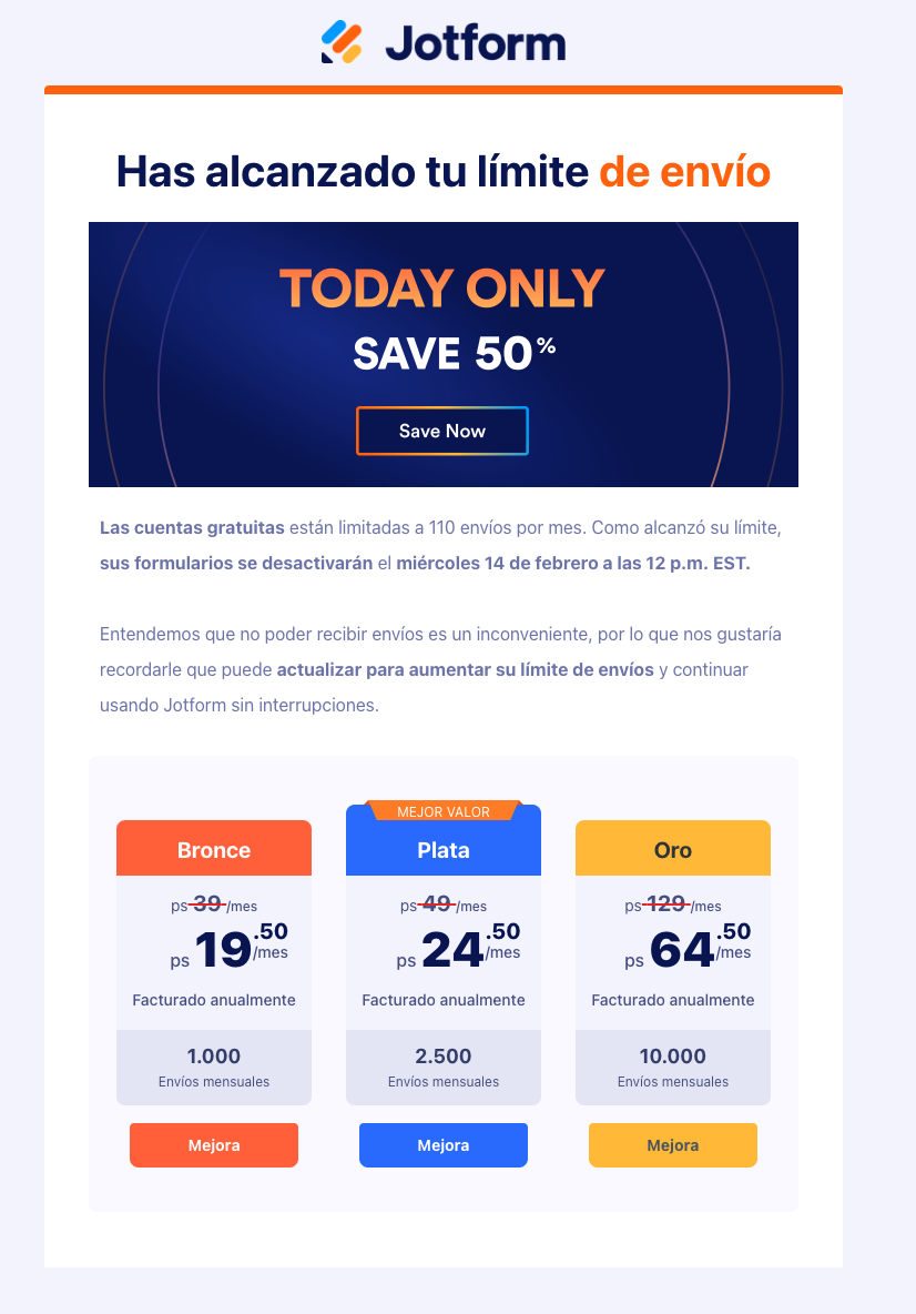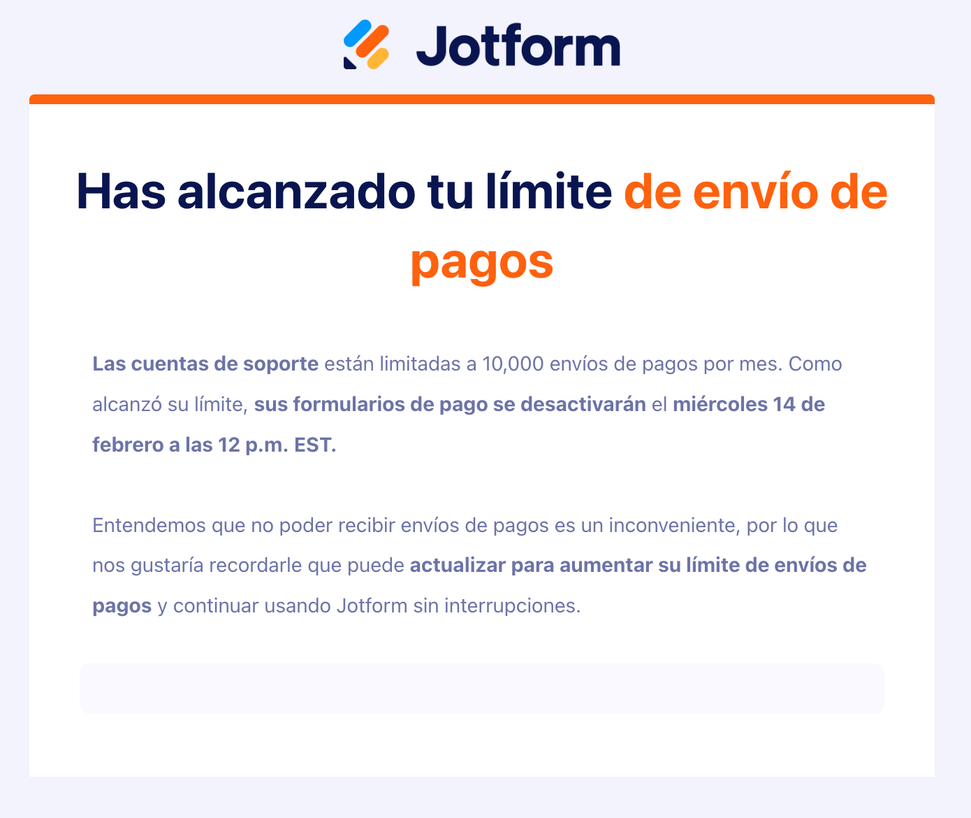 Cuando alcance sus límites mensuales como “Envíos Recibidos”, “Pagos Recibidos” y “Vistas de Formulario”, recibirá un email similar al que se muestra a continuación: Cuando alcance sus límites mensuales como “Envíos Recibidos“, “Pagos Recibidos” y “Vistas de Formulario“, recibirá un email similar al que se muestra a continuación: