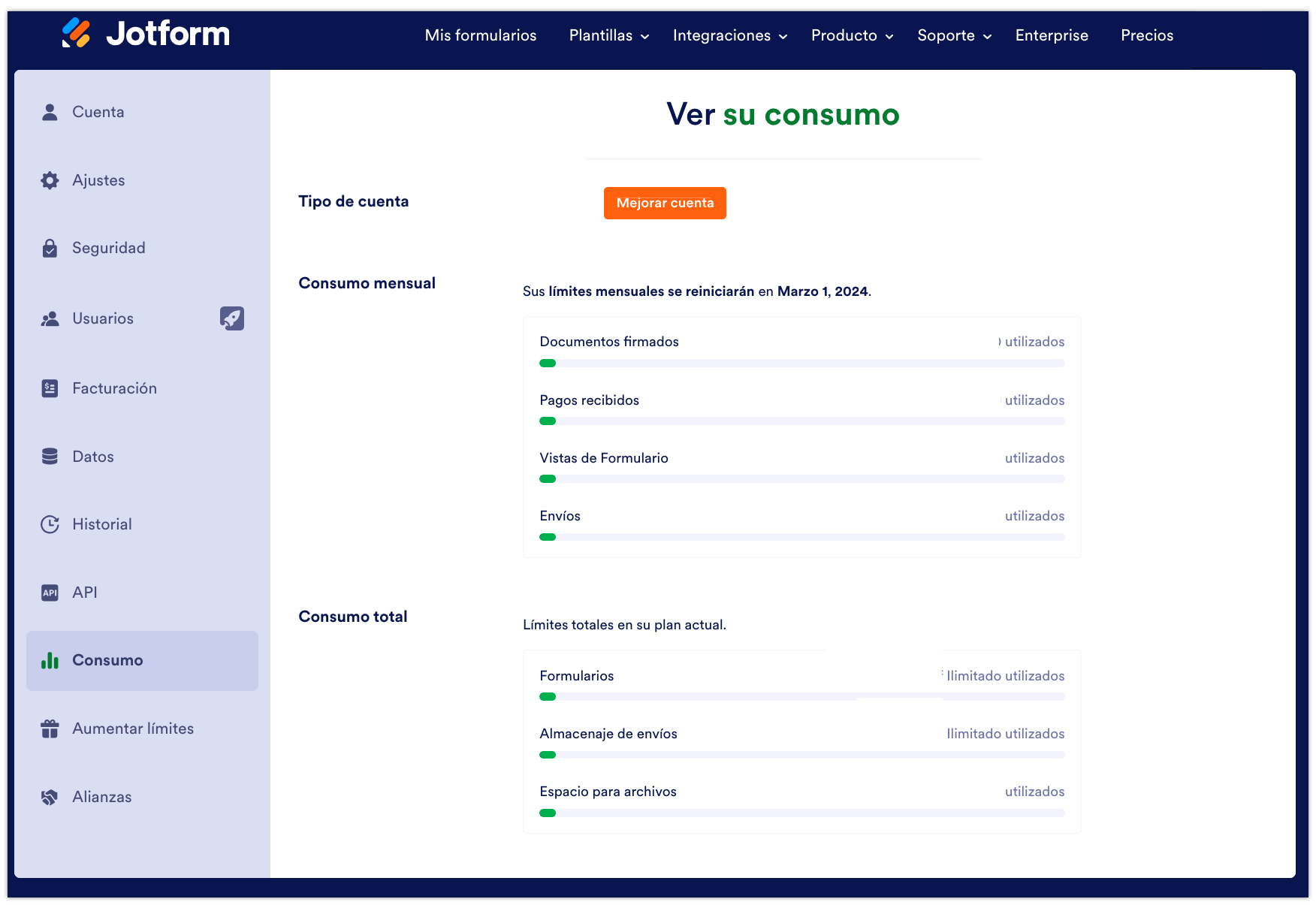 Cuando inicia sesión en su cuenta Jotform, puede ver la utilización actual haciendo clic en el AVATAR en la esquina superior derecha de la página. También navegando a la sección CONSUMO de su CUENTA.