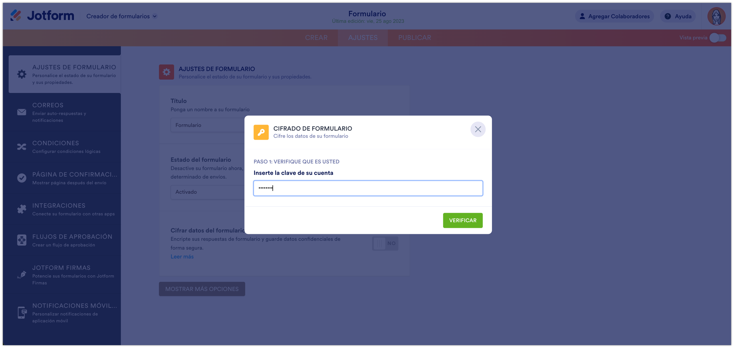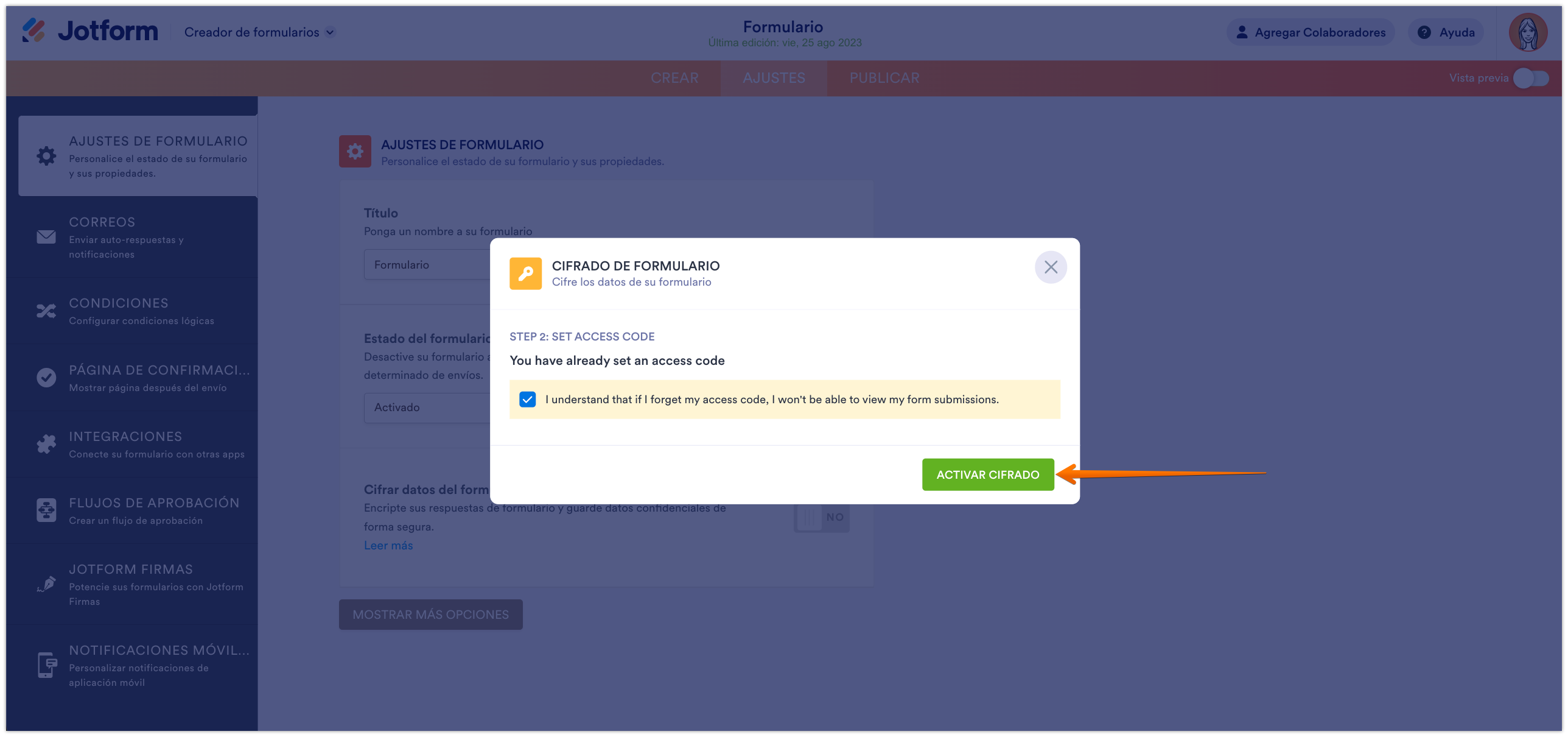 - Revisad Cifrar datos del formulario y conmutad el botón a Sí.