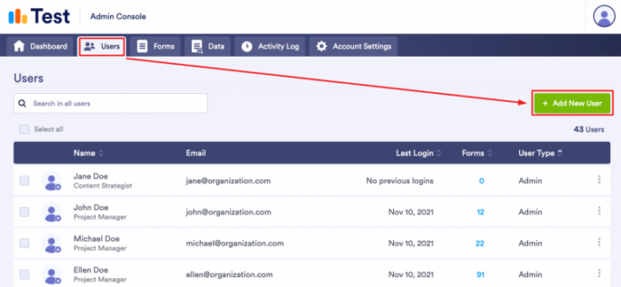 - En la Consola de Admin, seleccione Usuarios en la parte superior de la pantalla y clique en Añadir Nuevo Usuario.