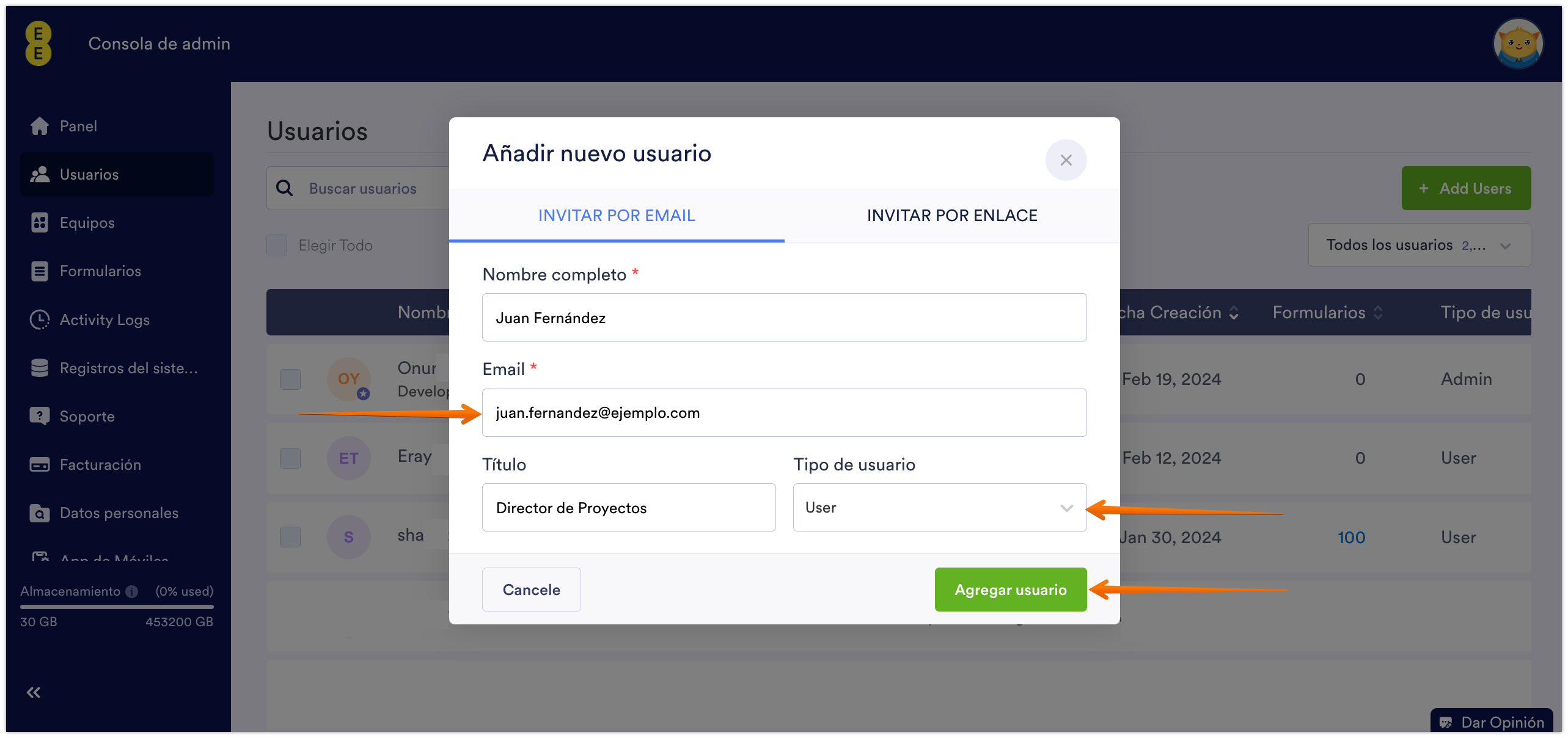 Esta guía muestra cómo añadir nuevos usuarios a su servidor Empresarial. Puede tanto añadir a un usuario enviando una invitación por email o añadir a múltiples usuarios enviando los links con invitaciones.