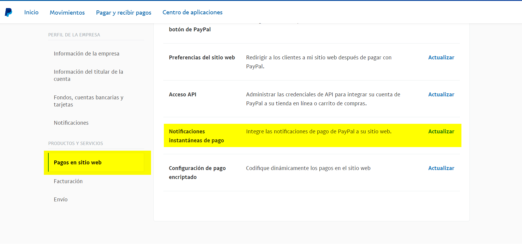 - Haga clic en el enlace Actualizar debajo de la opción Notificaciones instantáneas de pago.